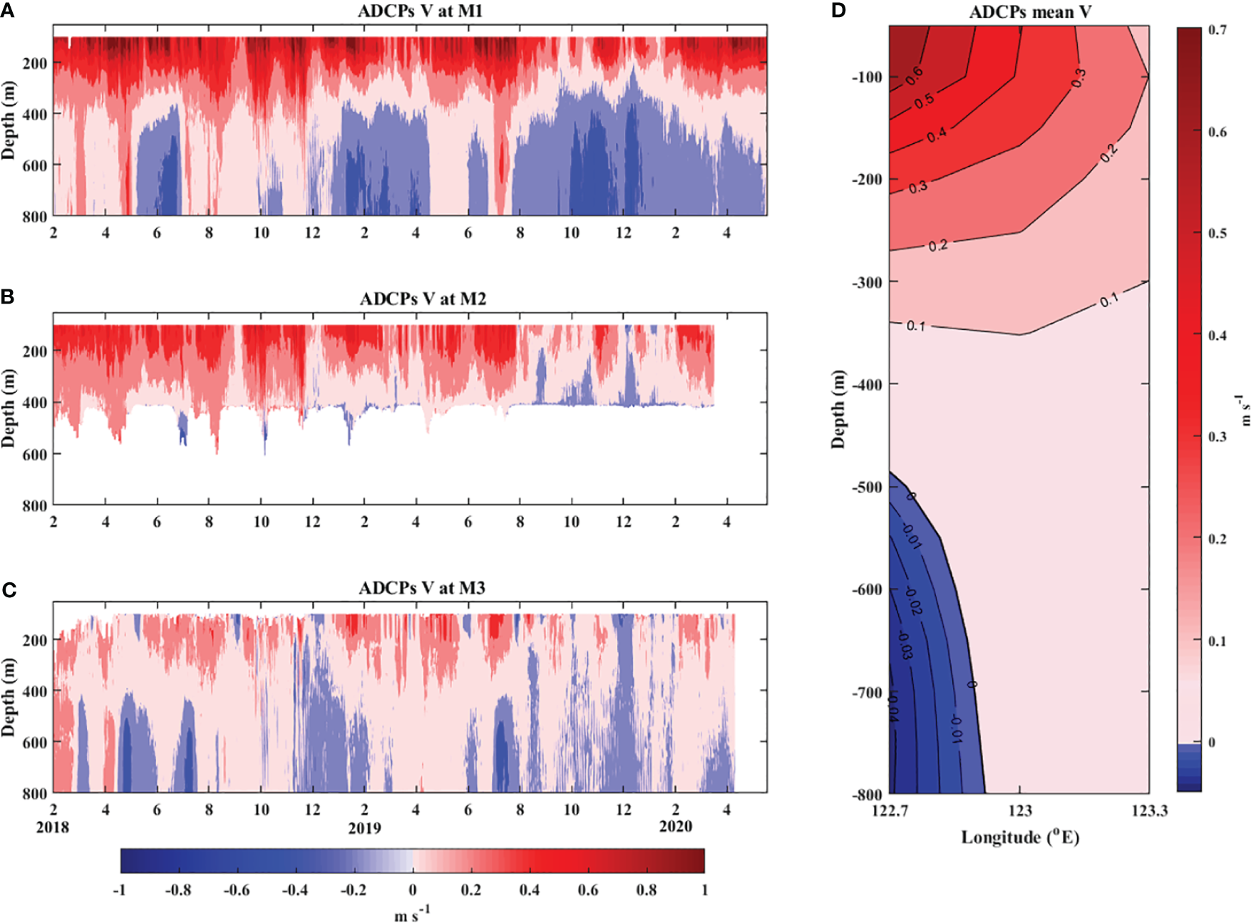 From January 2018 to May 2020, the meridional velocities observed at 18°N, (A) 122.7°E (M1), (B) 123°E (M2), and (C) 123.3°E (M3); (D) the time average of meridional velocities along 18°N based on three stations. Northward flow is set as positive (unit: m s-1).