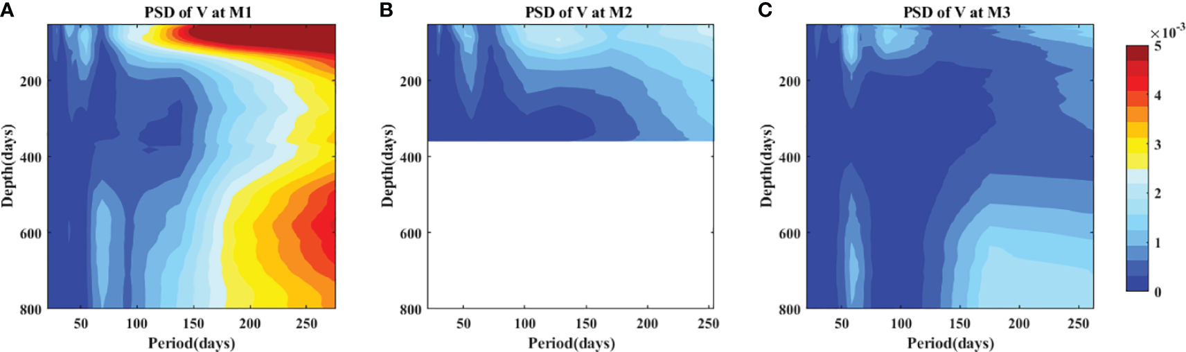 Power spectral density of the meridional velocities at (A) M1, (B) M2, and (C) M3 with depths during observation. Units are m2/(s2 cycles per day [cpd]).