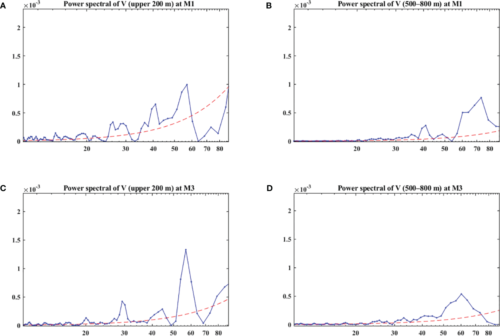 Power spectral of the meridional velocities in surface layer (0–200 m) and subsurface layer (500–800 m) obtained from ADCP measurements on M1 stations for (A, B) and on M3 stations for (C, D). The red dashed line indicates the 95% significance level. Units are m2/(s2 cycles per day [cpd]).