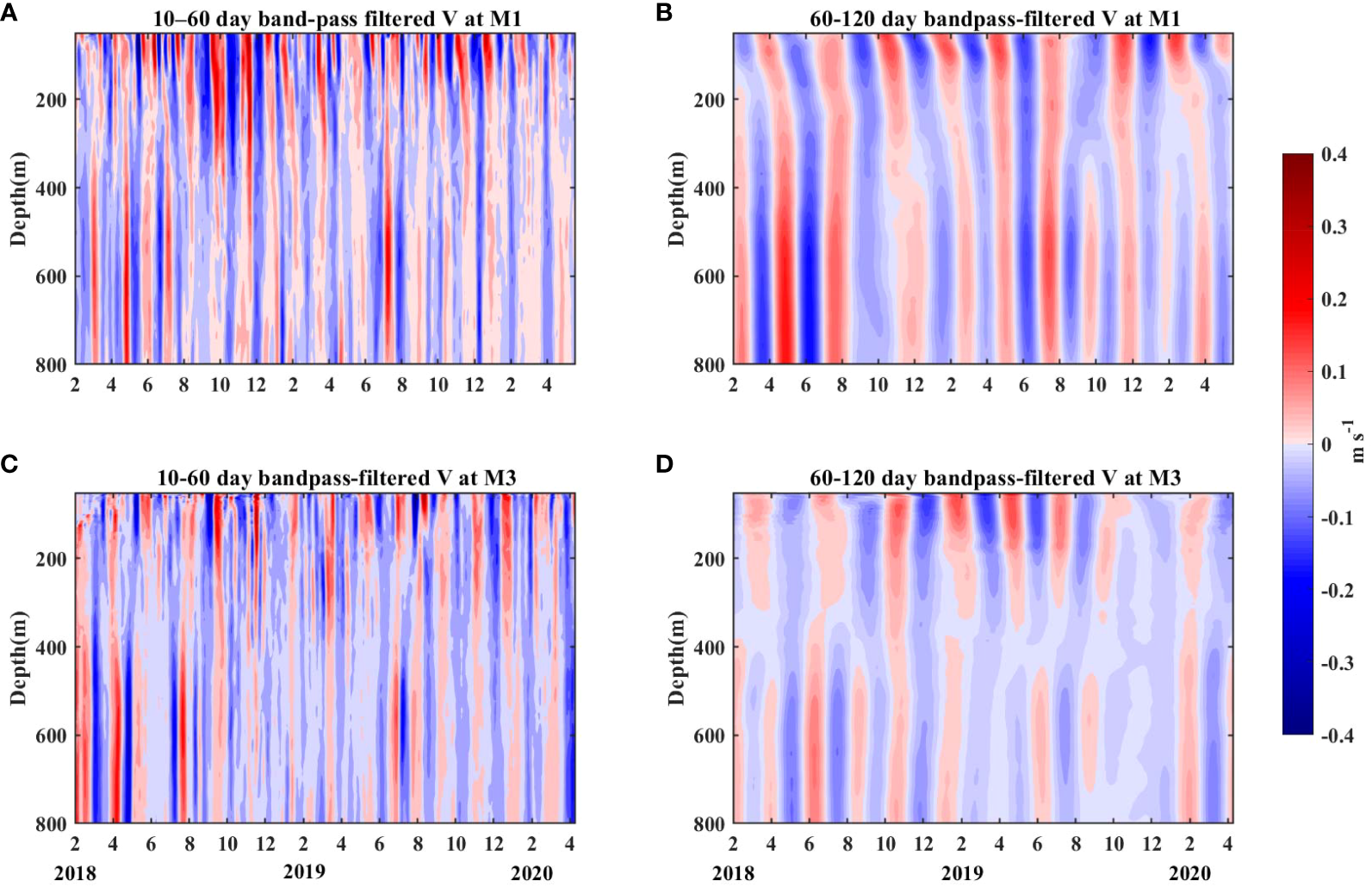 To distinguish the two different periods of ISVs, the time series of the meridional flow at the M1 site under 10–60 day band-pass and 60–120 day band-pass filter are shown in Figure 5. The depiction highlights the vertical distribution of ISV signals characterized by two different frequencies. Higher-frequency ISV signals primarily exist in the surface layer above 200 m, and lower-frequency ISV signals typically appear below 400 m. In addition, the same filter was performed on M3 in Figures 5C, D. The intensity of high-frequency ISV in the surface layer was significantly lower than that at M1, confirming the westward enhancement of the surface ISV. Similarly, the intensity of low-frequency subsurface ISV on M3 was significantly weaker than on M1.