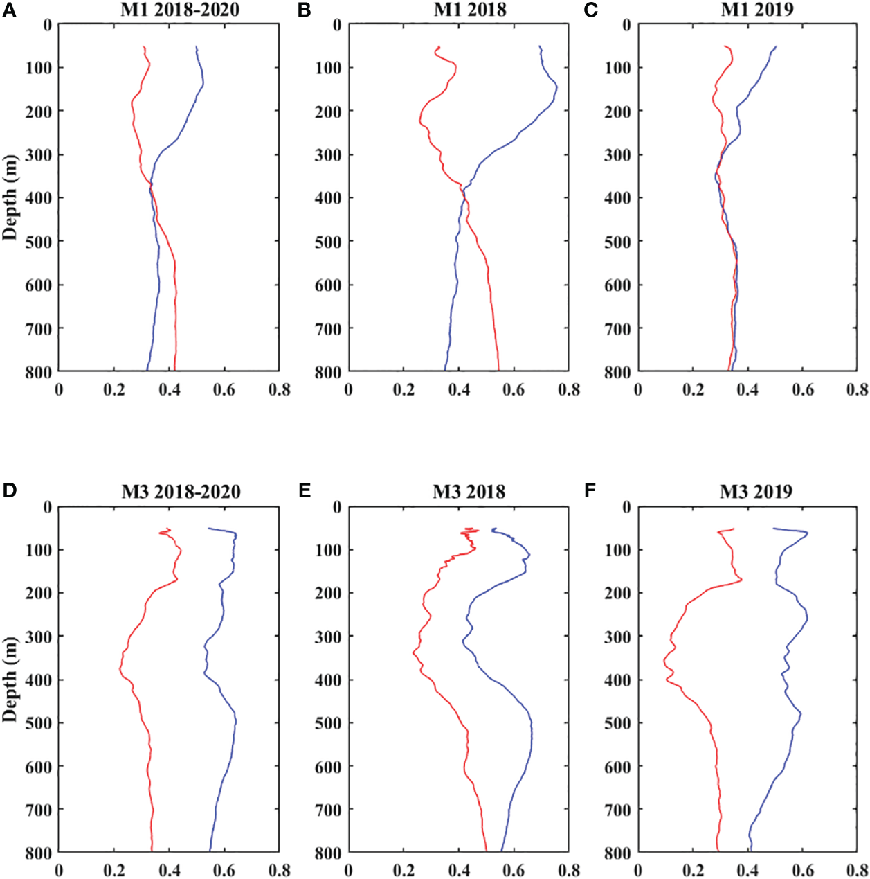 Percentage of two types of ISV signals in the total velocity variance at each depth derived from the mooring ADCP measurements. Blue and red lines indicate the meridional velocities under 10–60 d and 60–120 d band-passed filters, respectively. (A–C) represent the total time series, 2018, and 2019 on M1, respectively; (D–F) indicate those on M3.