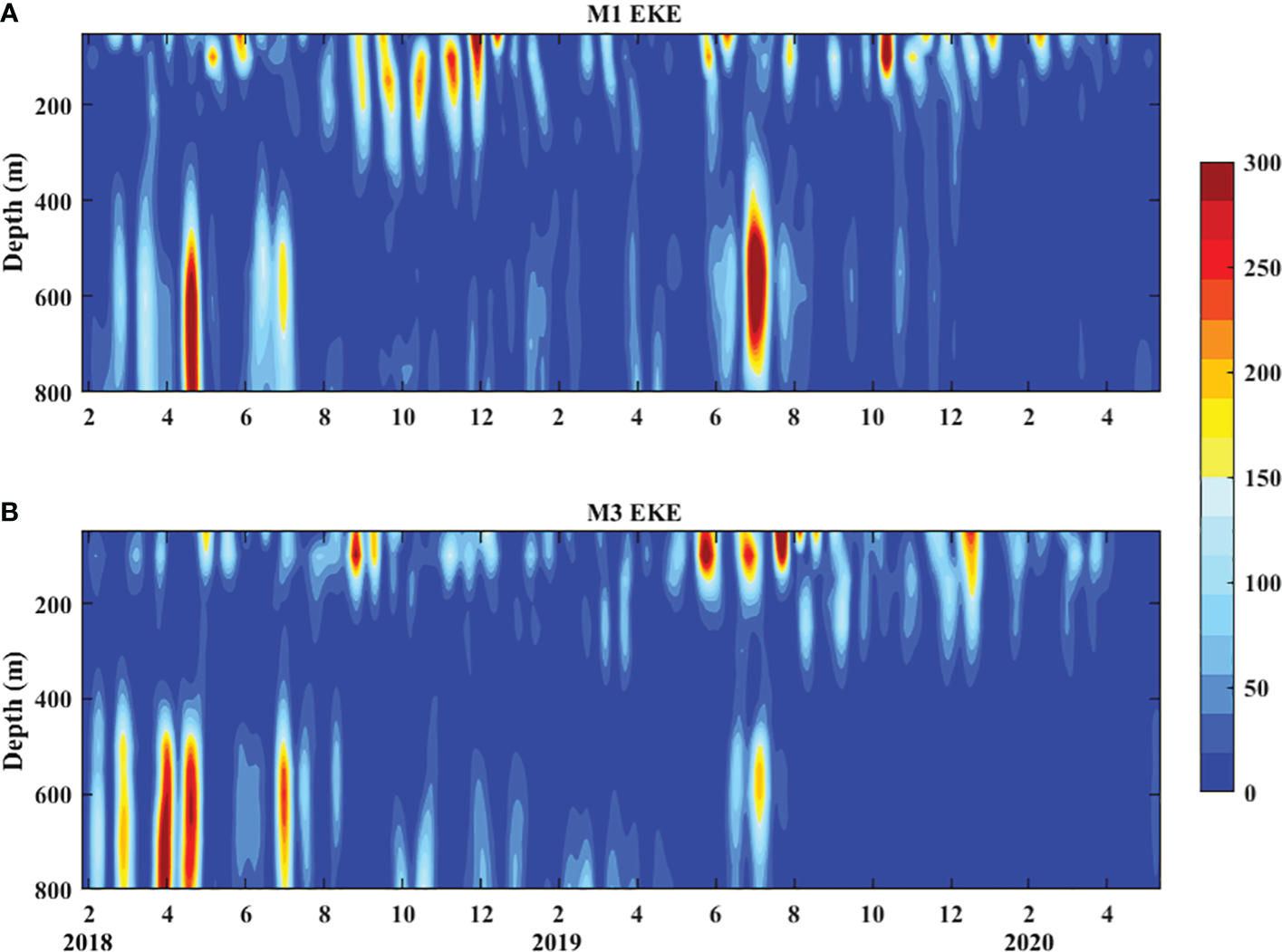Time series of EKE (unit: cm2 s-2) calculated from mooring observations on (A) M1 and (B) M3 between January 2018 and May 2020.