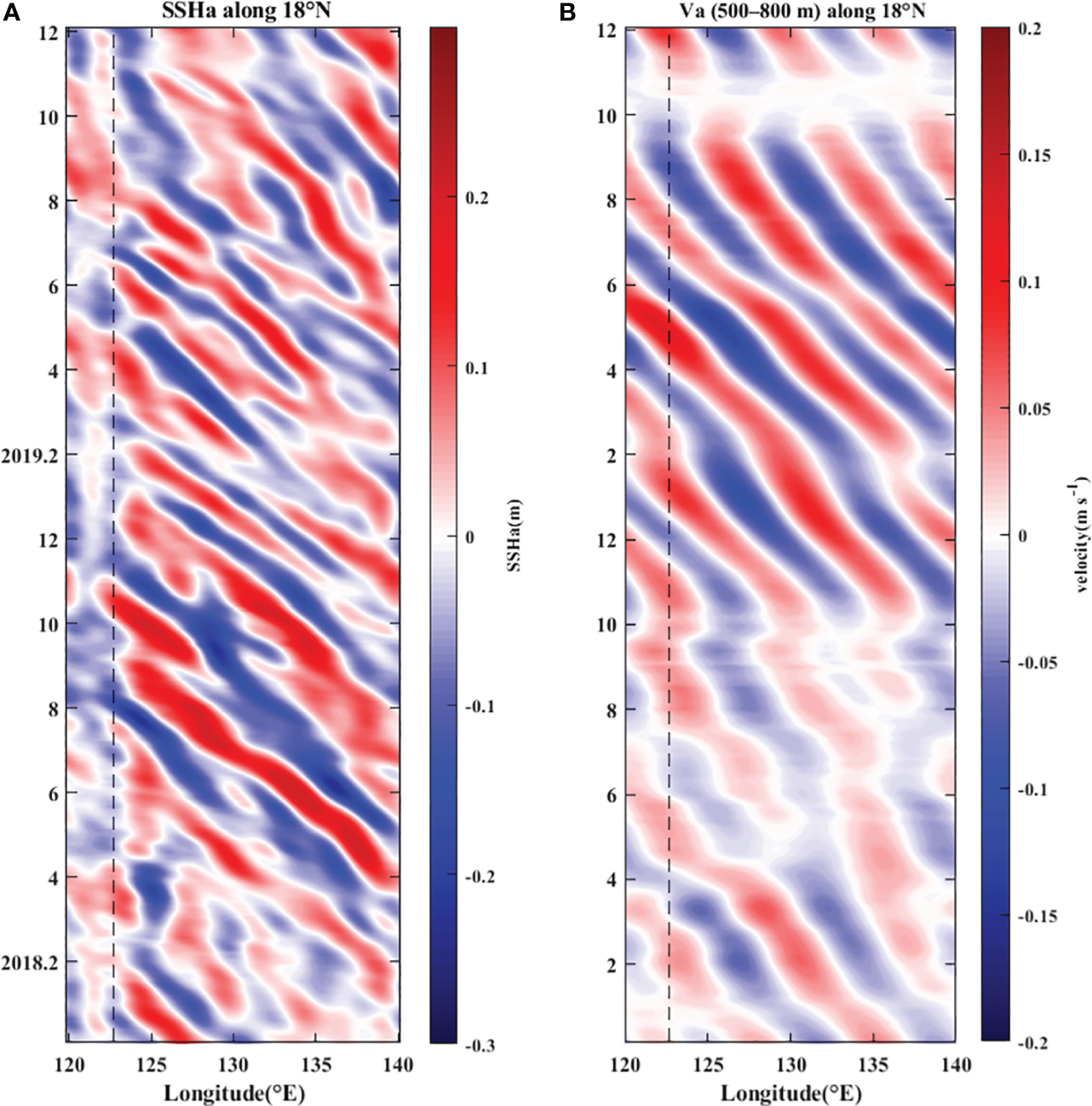 Figure 10B shows the time-longitude diagram of the subsurface meridional velocity anomaly under 60–120 day band-pass filter east of the KC source area along 18°N. Similarly, the ISV signals gradually increase as they move westward. In July 2019, the reversal of the LUC (Ma et al., 2022) resulted in a strong positive meridional velocity anomaly in the subsurface layer. This occurrence was consistent with the enhancement of subsurface EKE on the M1 station in July 2019.