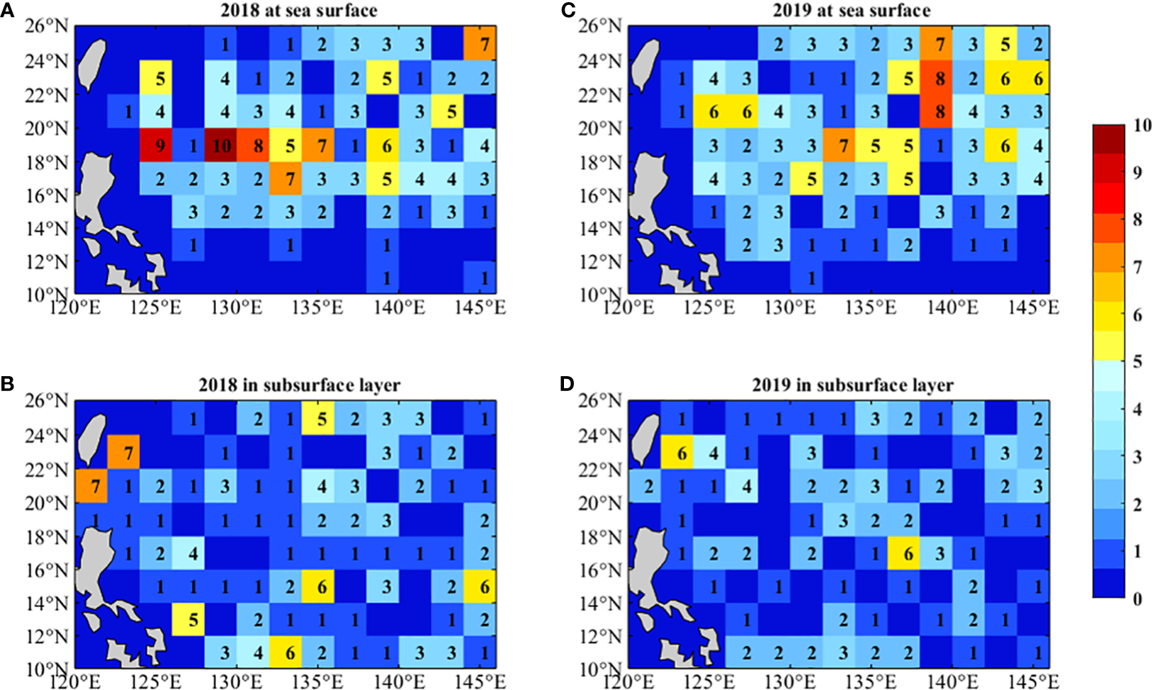 Spatial distribution of the eddy numbers generated in the 2° × 2° box (A) at sea surface in 2018 with satellite data, (B) in subsurface layer in 2018 from OFES data, (C) at sea surface in 2019 with satellite data, and (D) in subsurface layer in 2019 from OFES data.