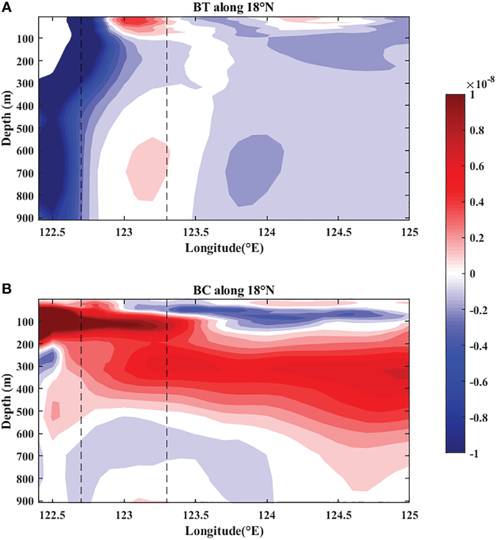 Time-averaged BT and BC in the surface layer are depicted in Figures 12A, B. A notable concentration of strong positive BT was observed north of Luzon Island, while the negative values were observed off the coast of the Philippines, which transitioned to positive values in the southeastern Philippine Sea. The BC is distinctly positive near the Luzon Strait south of Taiwan Island and off the northern coast of the Philippines, before turning negative south of 8°N. In the surface layer of three mooring stations, the calculated positive BC surpasses the absolute BT, indicating a significant energy shift from the eddy available potential energy to the eddy kinetic energy in this region. The enhanced eddy activities mean that more eddies move through the KC source area in a constant period, that increases the likelihood of strengthened surface high-frequency ISVs. In Figures 12C, D, the BC in the subsurface layer is consistently positive north of 10°N, while BT has a large negative value along the western boundary. To compare the vertical structure of BT and BC quantitatively, the longitude-depth of BT and BC along 18°N is averaged from 2001 to 2019, based on OFES output calculated in Figure 13. In the subsurface layer, a pronounced negative BT prevails west of 122.8°E, while the positive BC is notably smaller than the absolute value of BT. Consequently, at the M1 station, the dominant influence is attributed to the BT. As the negative BT converts the eddy kinetic energy into mean kinetic energy, the LUC characterized by a low frequency of ISV with a period of 70–80 days exists on M1. On the M3 station in the subsurface layer, the BT turns from negative to positive, and the positive BC is smaller than the positive BT. This results in LUC not having sufficient kinetic energy, which is consistent with the observed absence of LUC at 123.3°E/18°N. Consequently, there is no discernable subsurface low-frequency ISV enhancement at the M3 site.