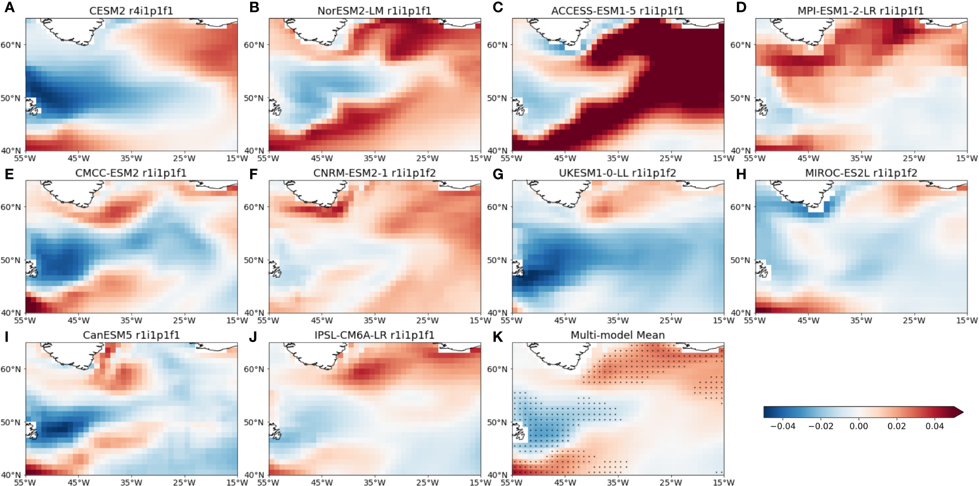 Maps of fgCO2 (kg m-2yr-1) difference between 31-year averages over 2070-2100 in the SSP585 scenario and that of 1970-2000 in the historical run for ten models (A-J), and in the multi-model mean (K) in the SPNA. In (K) dots indicate whenever changes in at least 8 out of the 10 models agree in the sign.