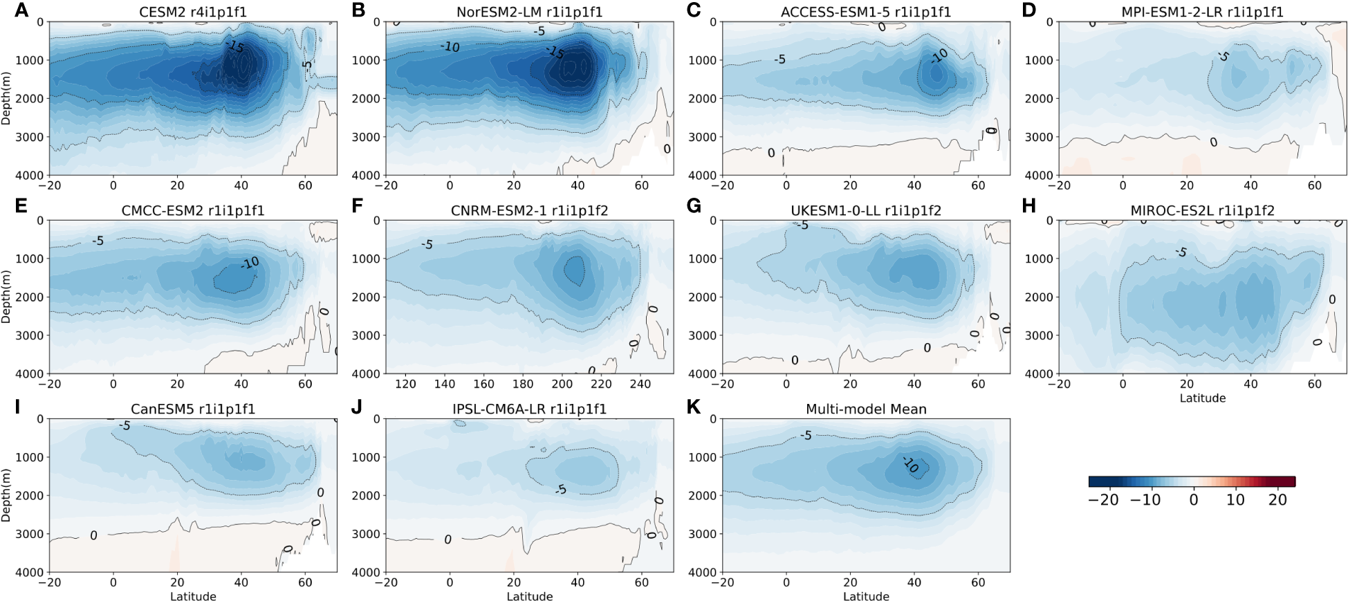 Maps of AMOC difference (in Sv) between 31-year averages over 2070-2100 in the SSP585 scenario and 1970-2000 in the historical runs for ten models (A-J) and the the multi-model mean (K), visualized as basin-wide zonal-and time-integrated stream function.