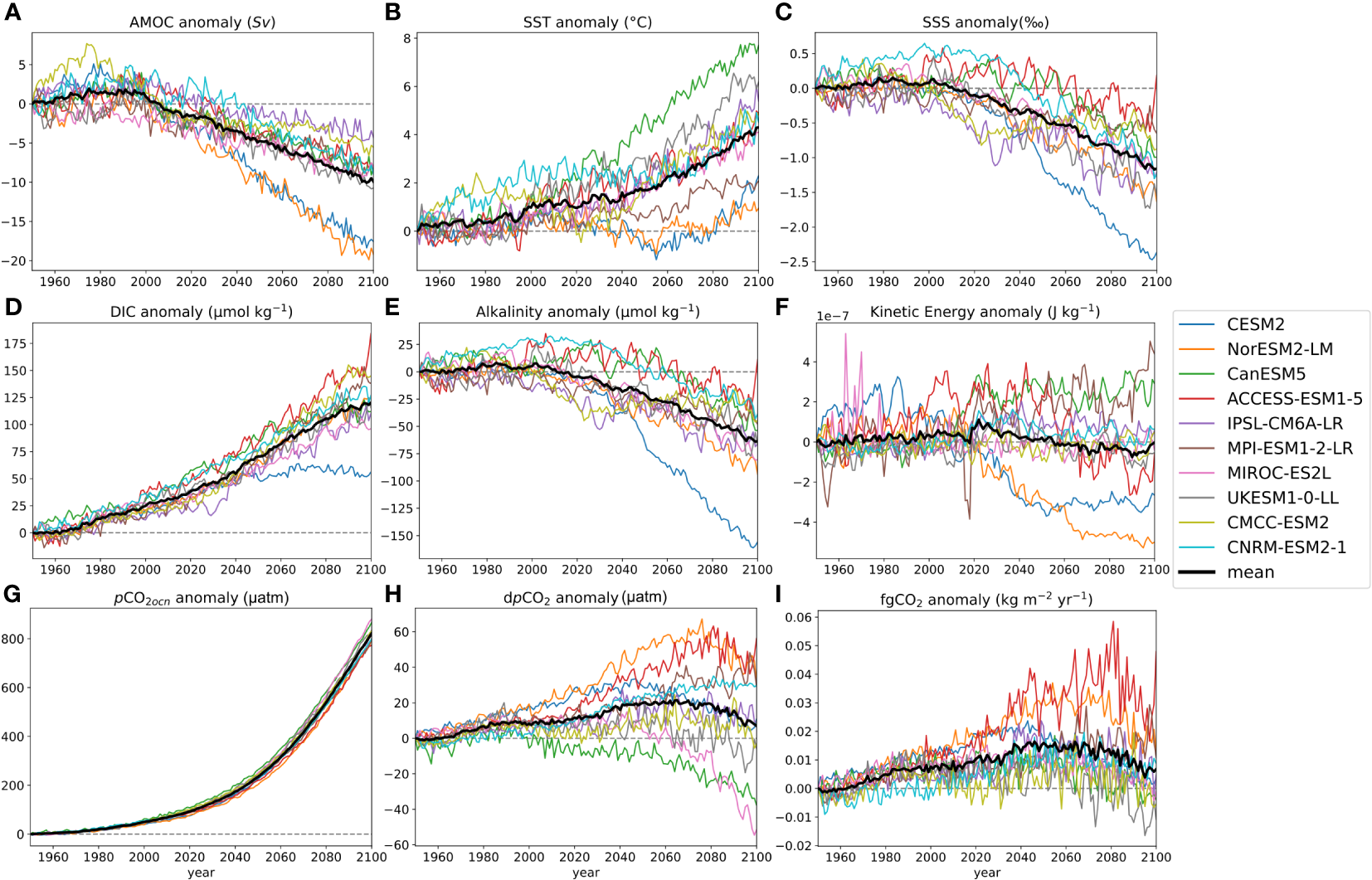 Annual time series of anomalies of physical and chemical variables in the SPNA. (A) AMOC anomaly at 40°N in units of Sv. (B) SST anomaly in °C. (C) SSS anomaly in units of ‰. (D) DIC anomaly in units of μmol kg-1. (E) ALK anomaly in units of μmol kg-1. (F) KE anomaly in units of J kg-1. (G)pCO2 anomaly in units of μatm. (H) dpCO2 anomaly in units of μatm. (I) fgCO2 anomaly in units of kg m-2yr-1. The time series include two periods - the historical period (1950-2014) and the future scenario (2015-2100, SSP5-8.5). The colored lines represent each model while the thick black line represents the ten models ensemble average.