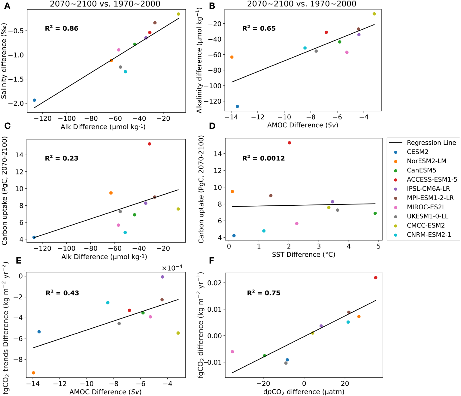 Correlation among various variables in the CMPI6 models analyzed. Differences are computed based on annual means over the region within the red box in Figure 1 (poleward of 40°N to 65°N and eastward of 55°W to 15°W) and calculated between 31-year average in SSP5-8.5 (2070-2100) and corresponding in the historical period (1970-2000) (A) Correlation of SSS (‰) and ALK (μmol kg-1) difference. (B) Correlation of ALK (μmol kg-1) and AMOC difference. (C) Correlation of carbon uptake (PgC) in future projections (2070-2100) and ALK (μmol kg-1) difference. (D) Correlation of carbon uptake (PgC) in future projections (2070-2100) and SST (°C) difference. (E) Correlation of fgCO2 trend difference (kg m-2yr-2) and AMOC (Sv). (F) Correlation of fgCO2 difference (kg m-2yr-1) and dpCO2 (μatm).
