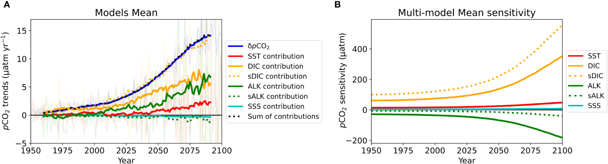 Drivers of ocean surface pCO2 trends and pCO2 sensitivity. (A) Drivers of pCO2 trends, calculated by , where X = SST, DIC, sDIC, ALK, sALK or SSS. The color lines show the ocean surface pCO2 trend (blue solid), and the contributions of changes in SST (red solid), DIC (orange solid), sDIC(orange dotted), ALK (green solid), sALK (green dotted) and SSS (light blue) to the ocean pCO2 trends, in addition to the sum of the four drivers (dark grey dotted). The transparent lines indicate the annual trends and the solid lines are the 20-year running average. (B)pCO2 sensitivity, calculated by , where X_stdev is the standard deviation of each variable over 1950-2100. The color lines show the ocean surface pCO2 sensitivity to SST (red solid), DIC (orange solid), sDIC(orange dotted), ALK (green solid), sALK (green dotted) and SSS (light blue). The standard deviation of SST, DIC, sDIC, ALK, sALK or SSS are 1.14 °C, 38.78 μmol kg-1, 64.54 μmol kg-1, 21.41 μmol kg-1, 4.92 μmol kg-1 and 0.40 ‰, respectively.