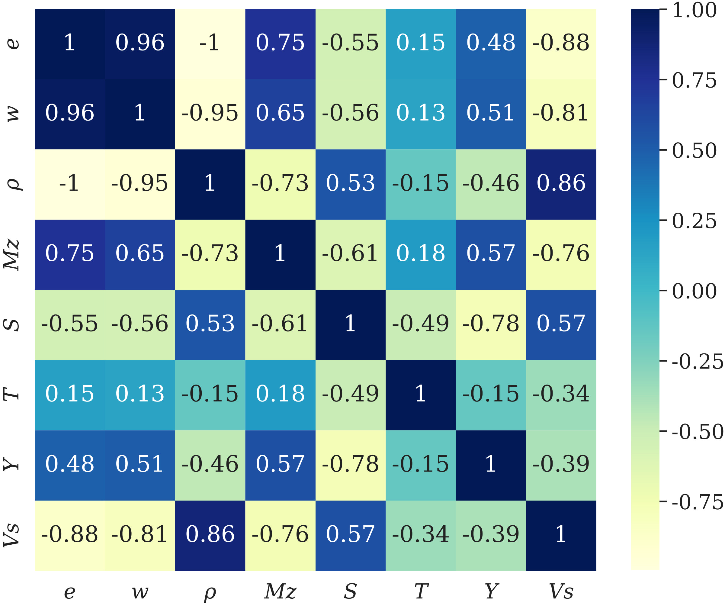 Pearson correlation coefficient matrix for each factor. The last column shows the Pearson correlation coefficient between the shear wave speed of the sediments and physical parameters.