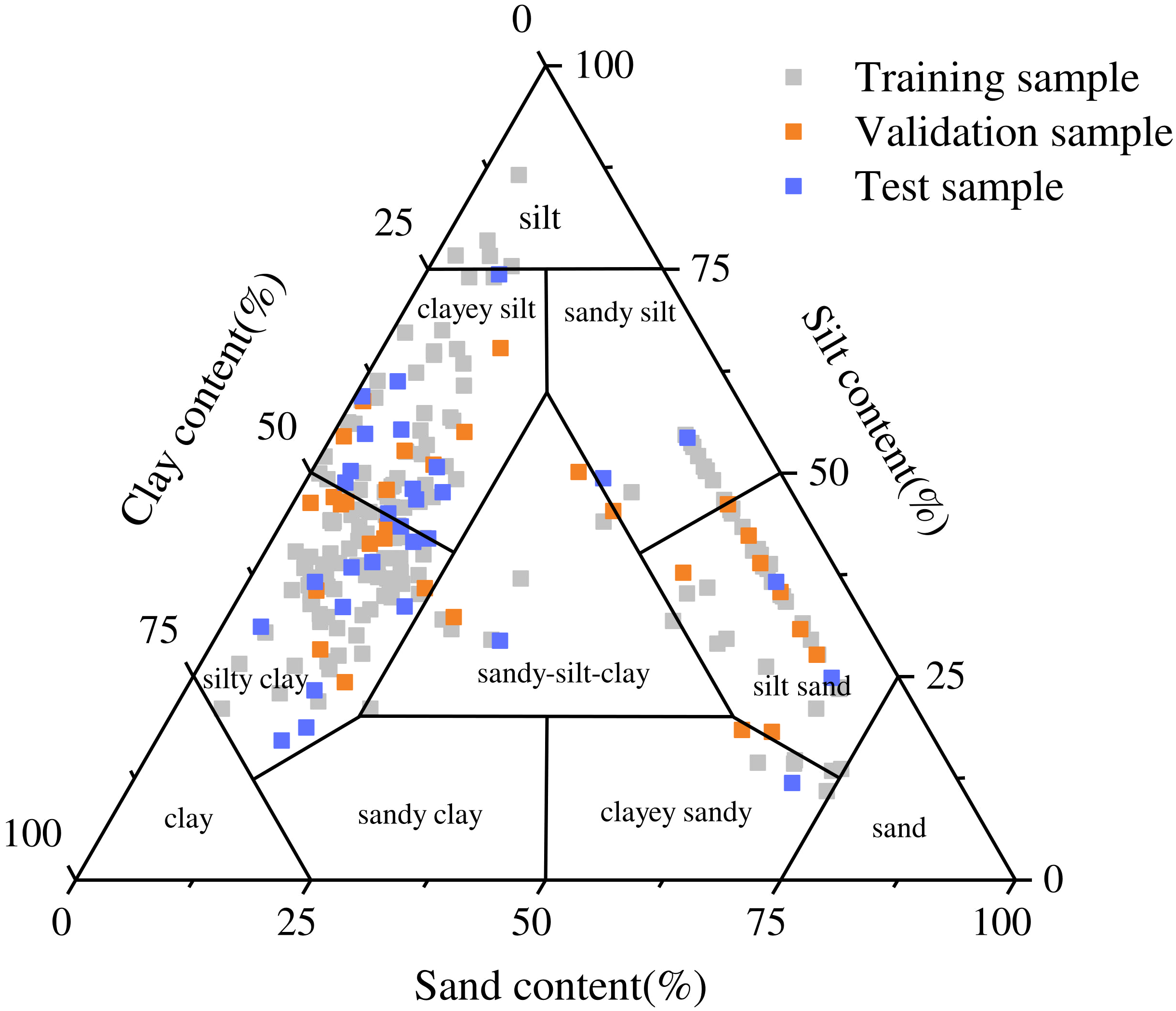 Sediment triangulation map of dataset delineation results in this paper. The gray data points in the figure represent the training data, the orange data points represent the validation data, and the blue data points represent the test data.