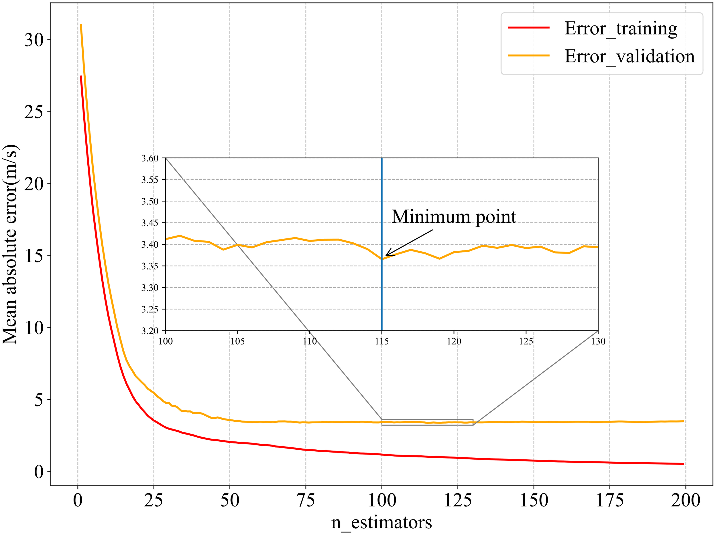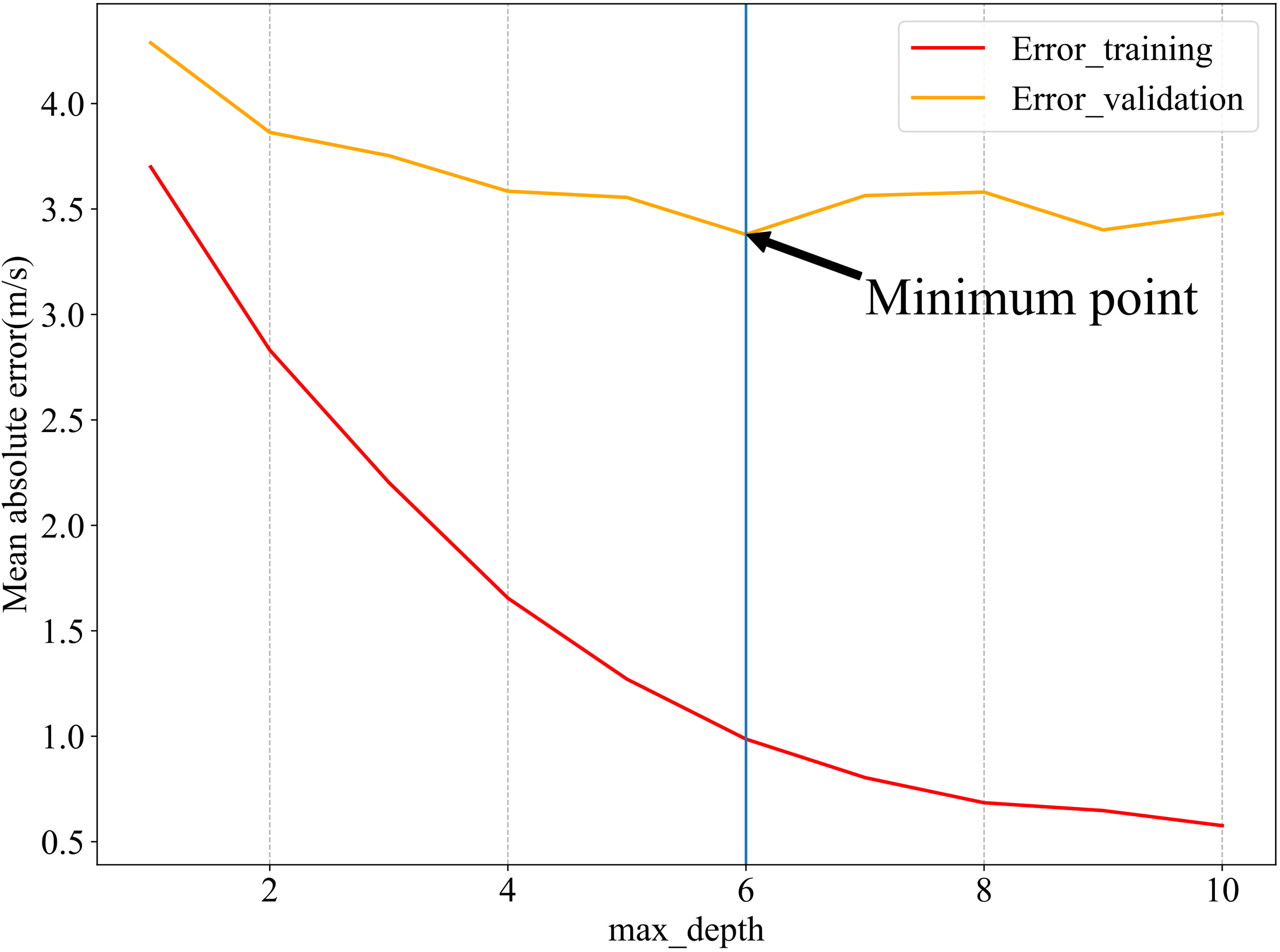 At first, the 166 sets of training data were substituted into the model for training by using the default hyperparameters in XGBoost to train the data, which was called Model0. Substituting the validation data into Model0, the validation goodness of fit of Model0 was 0.902, and the MAE and MAPE between the validation data and the real values were 3.926 m/s and 12.2%, respectively. In order to obtain a better fitting effect, some hyperparameters were adjusted using a random search method and crossvalidation function. The results are shown in Table 2. The adjusted parameters were entered into the model, and the model was retrained, which was called Model1. Now, the MAE, MAPE, and R2 for the validation data were 3.41 m/s, 10.1%, and 0.913, respectively. Compared with the results of Model0, the prediction performance of Model1 was improved with a smaller MAE and higher R2.