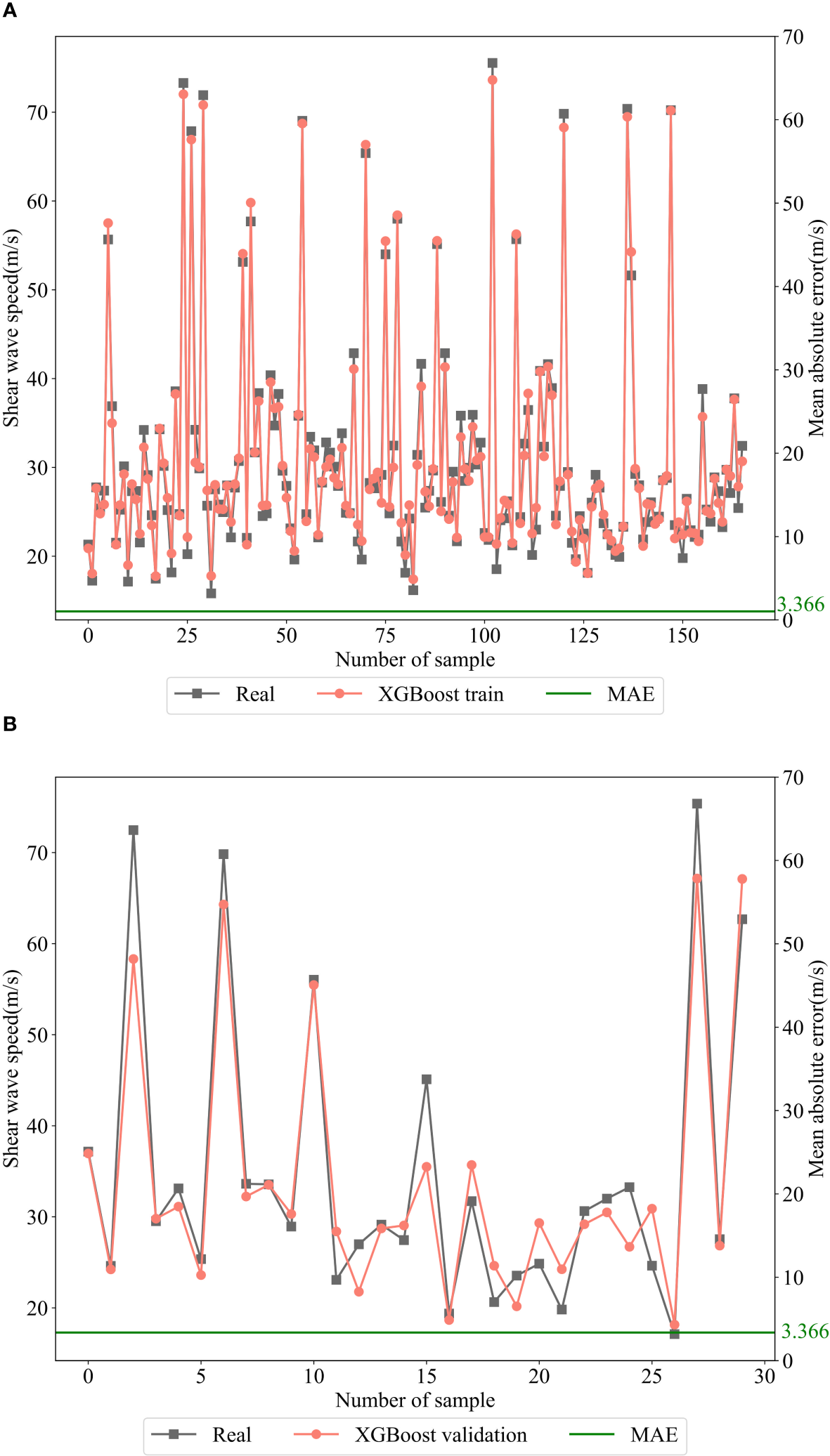 Comparison of predicted and real values: (A) 166 sets of training sample; (B) 30 sets of validation sample. The solid green line represents the MAE between each prediction value and the real values.