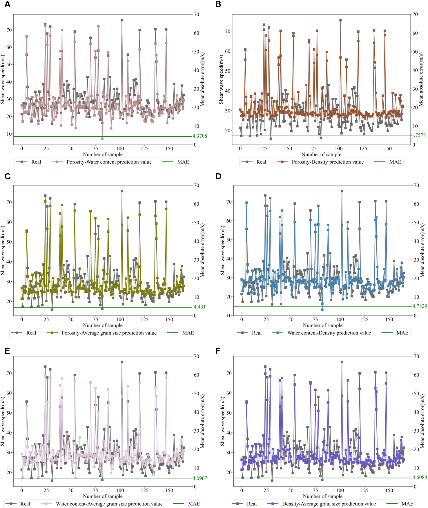 Comparison of predicted shear wave speed from the dual-parameter prediction models with real values: (A) porosity—water content, (B) porosity—density, (C) porosity—average grain size, (D) water content—density, (E) water content—average grain size, and (F) density—average grain size. The gray curve in the figures represents the real values, and the solid green lines show the mean absolute error between the predicted and real values of the 166 training samples.