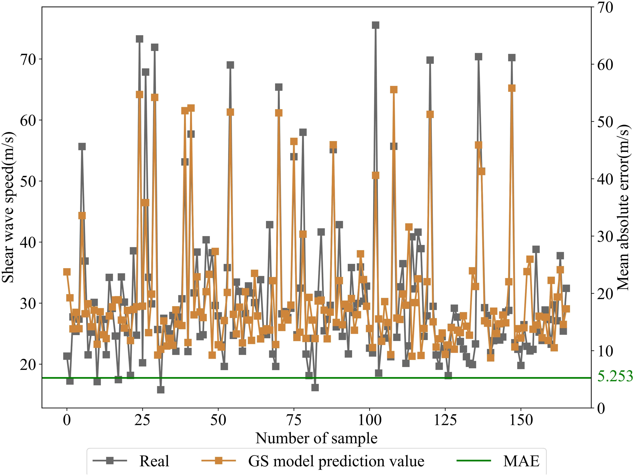 Compared with the single-parameter prediction models, the dual-parameter prediction models, and the GS prediction model, the multiparameter shear wave speed prediction model based on the XGBoost algorithm has the lowest MAE and MAPE between the test data and the predicted values, which are 4.04 m/s and 14.3%, respectively. It indicates that the multiparameter shear wave speed prediction model based on the XGBoost algorithm has a higher accuracy for predicting the shear wave speed in this area (2).