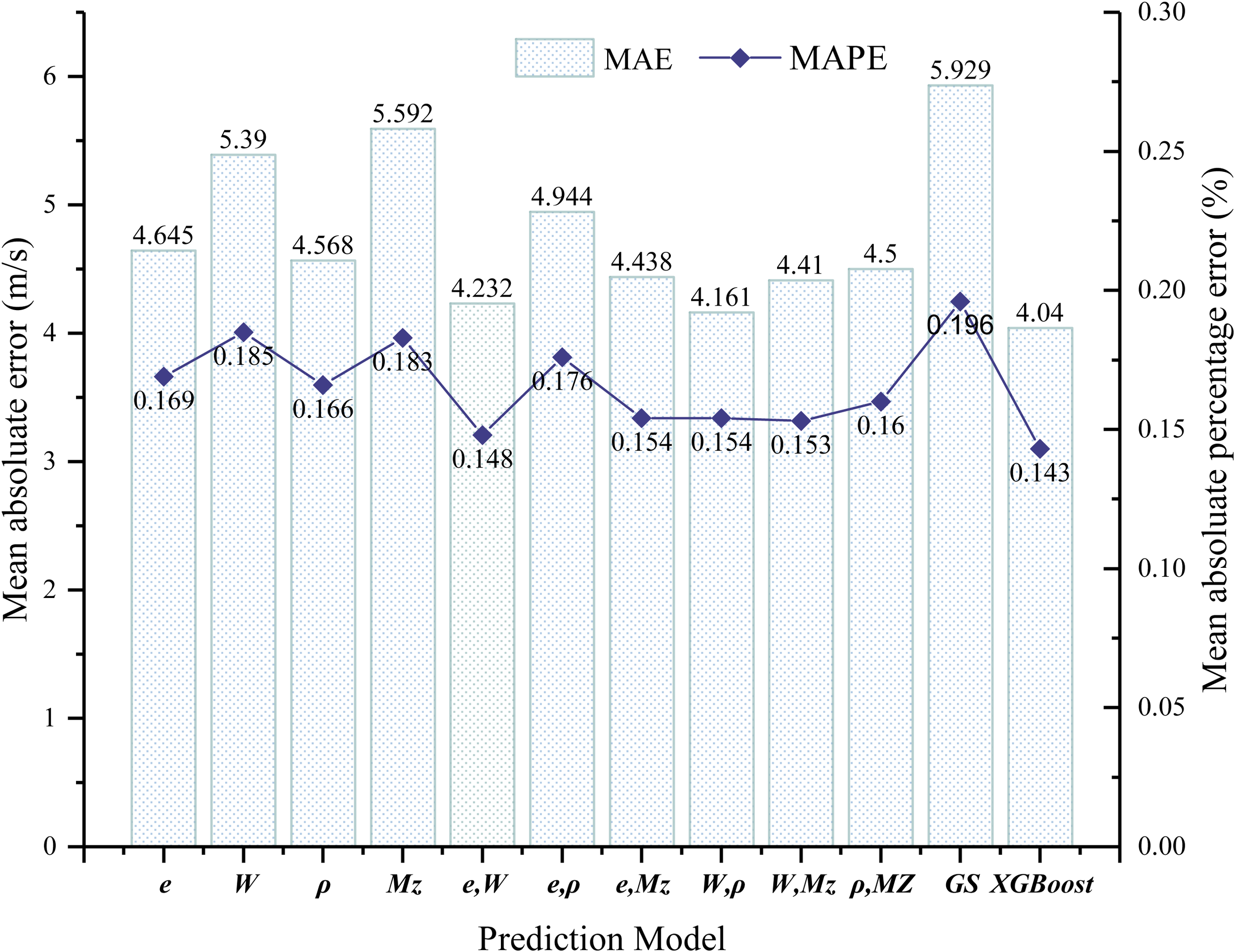 To check the accuracy of model fitting, 30 groups of test data that were not involved in model building were substituted into each prediction model, and the difference between the predicted values and the real values of different models was analyzed. The MAEs and the MAPEs between the predicted values and the real values of each model were calculated, and the results are shown in Figure 10. It can be seen that the XGBoost model has the smallest MAE and MAPE and the highest goodness of fit compared to the single-parameter prediction models, dual-parameter prediction models, and GS prediction model.