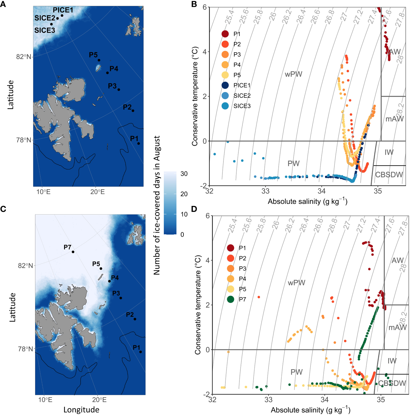 Location of the sampling stations and sea-ice cover during the sampling period (indicated as number of ice-covered days during August) in 2018 (A) and 2019 (C). The approximate location of the polar front based on the 200 m isobath is indicated with a black line. During the sampling campaign in 2018, sea ice was only present at stations PICE1 and SICE2-3 in the Arctic Ocean basin. During the 2019 sampling campaign, sea ice was present at P4, P5 and P7. (B) shows a t-s-plot of water masses in 2018 and (D) in 2019 (PW, Polar Water; IW, Intermediate Water; CBSDW, Cold Barents Sea Dense Water; wPW, warm Polar Water; AW, Atlantic Water; mAW, modified Atlantic Water, following definitions by Sundfjord et al., 2020).