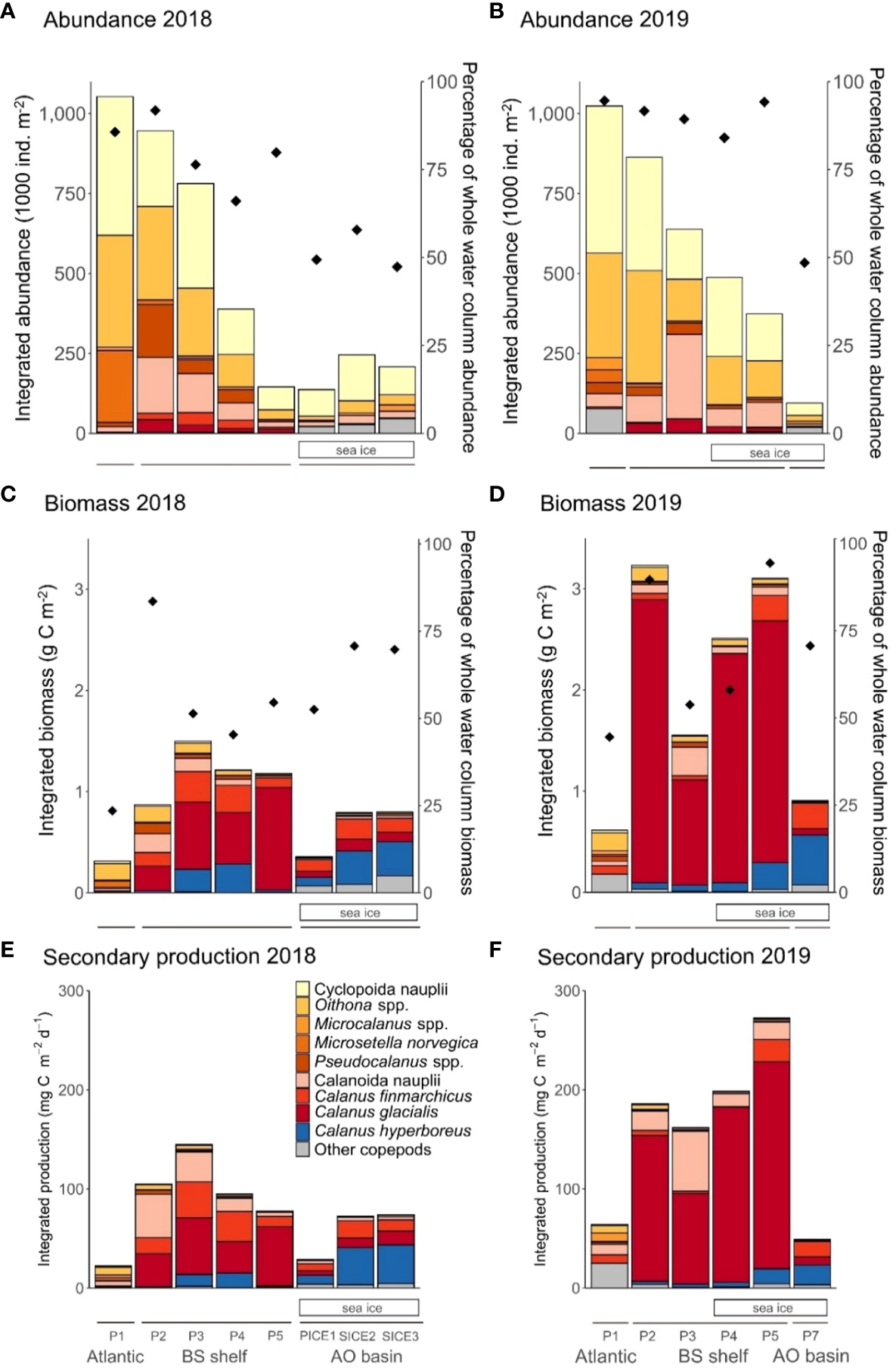 The secondary production of copepods in the Arctic Ocean basin ranged from 28.9-74.0 mg C m-2 d-1 in 2018 to 49.2 mg C m-2 d-1 in 2019 and resulted mainly from the production of Calanus spp. (72-89% in 2018, 89% in 2019) (Figures 2E, F).