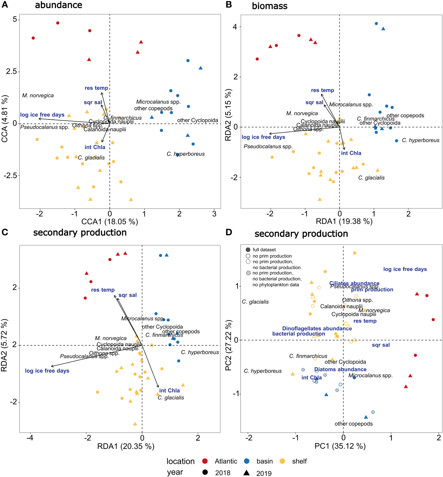 To test whether there was a significant difference in copepod community composition between the two years (2018 and 2019) and locations (stations P1, P2, P3, P4, P5), a permutation test was performed for a Constrained Correspondence Analysis (CCA) on abundance data and for a Redundancy Analysis (RDA) on biomass and secondary production data. Due to the nature of the data, a CCA was chosen for the abundance data (count data appropriate for Chi-square distances) and an RDA for biomass and secondary production data (both continuous variables appropriate for Euclidean distances). The explanatory variables in the CCA and RDAs included year and location. The interaction term (year x location) was included in the model to capture interannual differences of the copepod community along the transect. The significance of the overall model and individual terms were obtained by permutation testing (1000 permutations) at a significance level of α = 0.05.