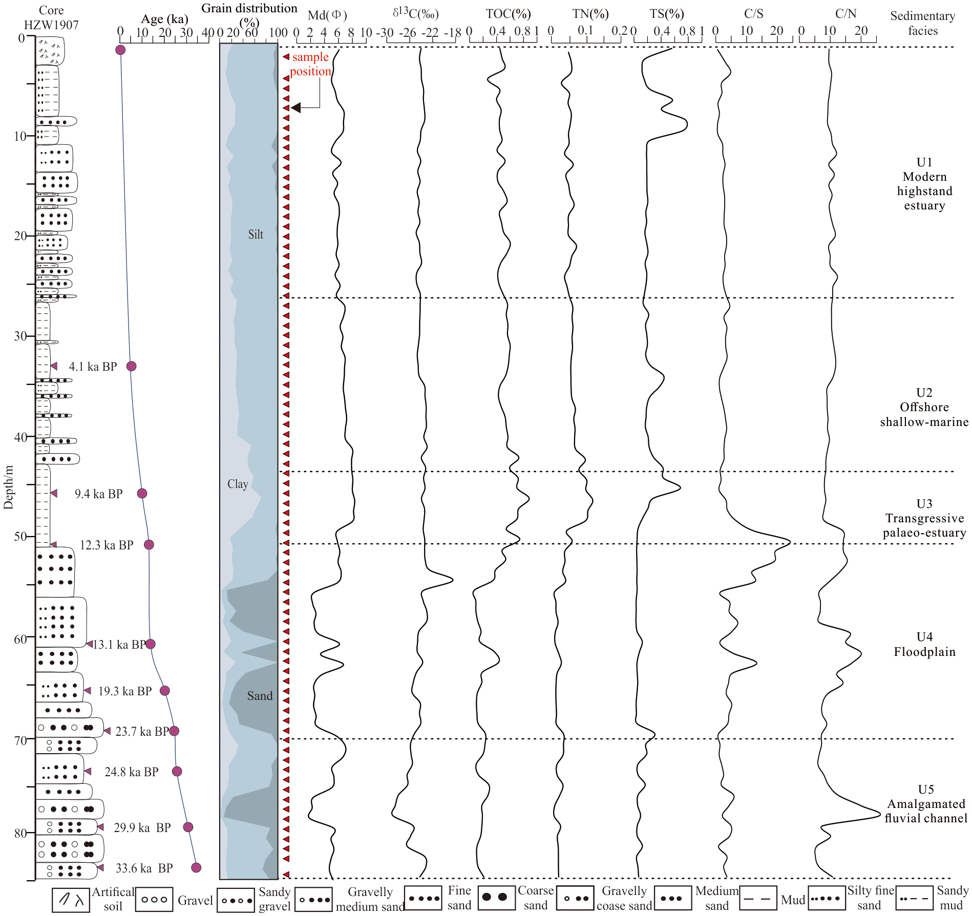Figure 2 Downcore variations in δ13C, total organic carbon (TOC) content, total nitrogen (TN) content, total sulfur (TS) content, C/S ratio, and C/N ratio of the HZW1907 core. Note: Lithology, 14C age, grain composition, and sedimentary facies for core HZW1907, adapted from Gao et al. (2023).