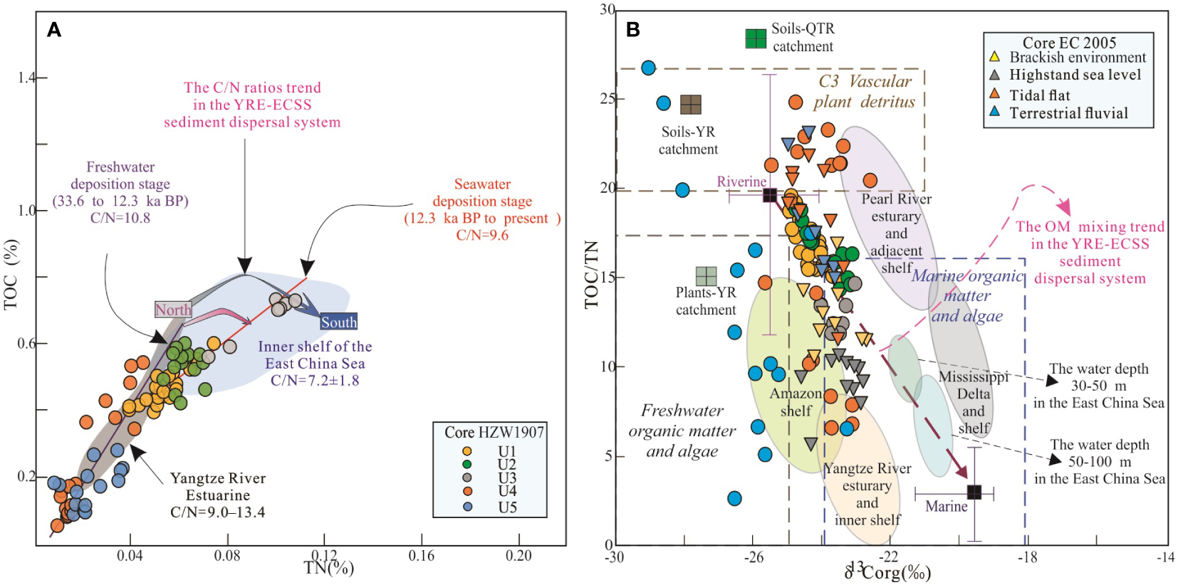 Figure 3 (A) The scatter plot of TOC and TN in the HZW1907 core sediment samples, compared with modern sediments in ECSS, adapted from Wu et al. (2007). (B) The range in weight C/N and δ13C values for the main sources of organic matter in HZW1907 at different stages, adapted from Lamb et al. (2006). Data of the Yangtze River estuary and inner shelf from Liu et al. (2020); soils-YR catchment, plants-YR catchment from Wu et al. (2007); riverine from Liu et al. (2007); soils-QTR catchment from Liu et al. (2017); marine from Liu X.T. et al. 2018; OM in different water depths from Wang et al. (2021); Amazon shelf (Showers and Angle, 1986); Mississippi Delta and adjacent shelf (Bianchi et al., 2002); and Pearl River estuary (Hu et al., 2006).