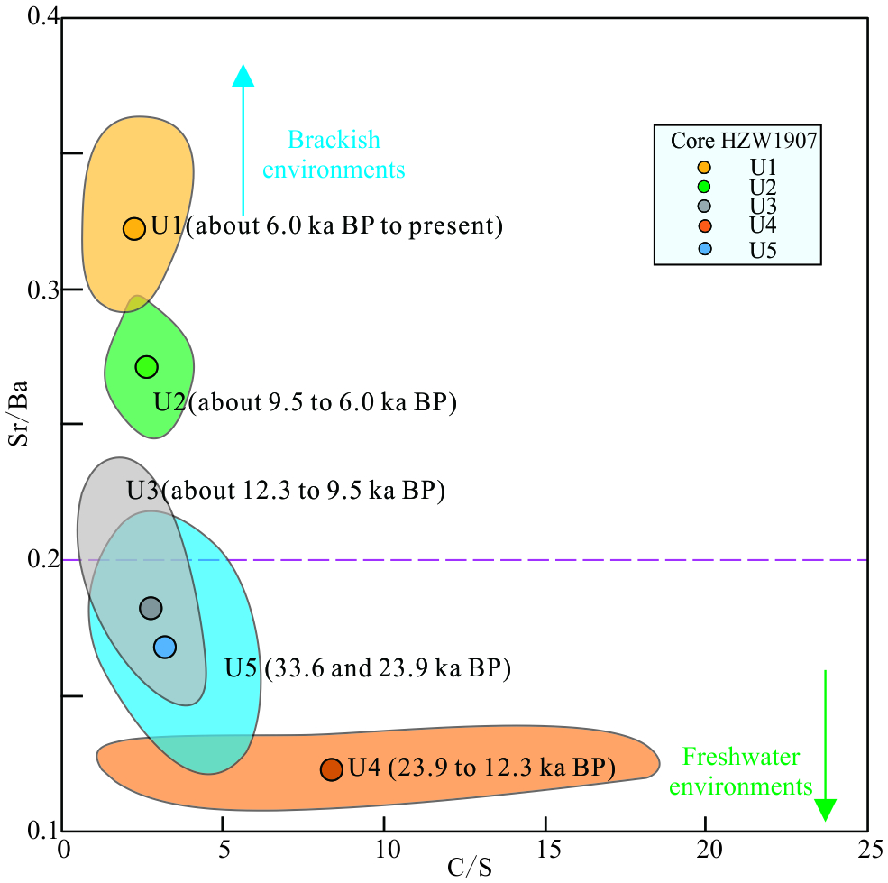 Figure 6 Discrimination plot of C/S versus Sr/Ba for the bulk sediments of the HZW1907 core. Element contents of Sr and Ba for the sediments from Gao et al. (2023). The purple dotted line is the boundary between freshwater and brackish environments, where Sr/Ba is 0.2 according to Wei and Algeo (2020).