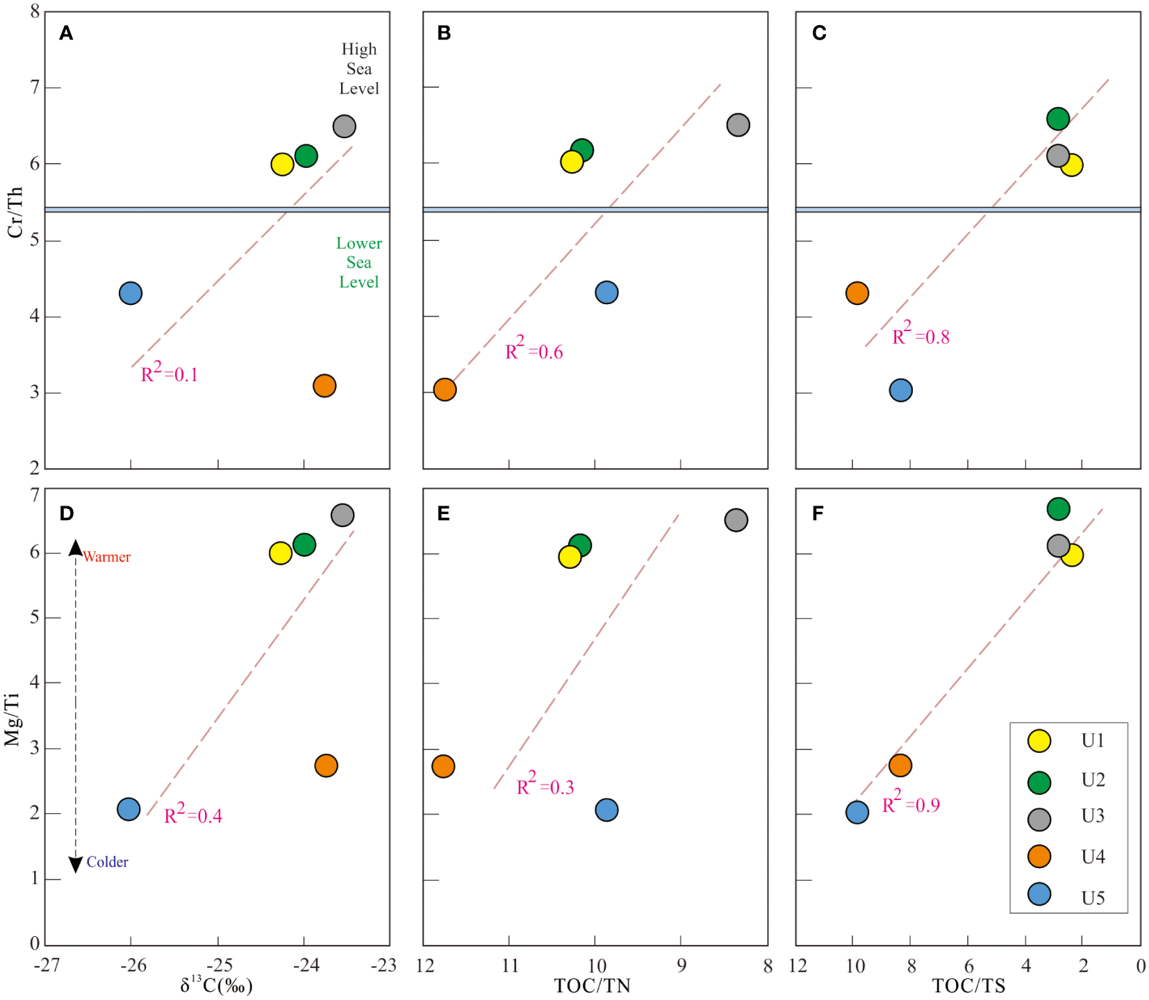 Previous studies have demonstrated that C/S and C/N ratios, which are sensitive to sea-level and climatic changes in the ECS inner shelf (Liu X. T., et al., 2021; Chang et al., 2023), can be examined together to reveal the depositional evolution from terrestrial to marine environments. Additionally, as mentioned above, the content of OM in the HZW1907 core is likely to be limited by the condition of the environment. There are relatively apparent correlations between C/S and C/N ratios in sediments and the ratio of Cr/Th, with their R2 being more than 0.6 (see Figures 7B, C). Additionally, there is a robust correlation between C/S and C/N ratios and Mg/Ti (R2 = 0.9 and 0.3, respectively; refer to Figures 7E, F) for climate change, suggesting that the C/S ratio can be used more sensitively to distinguish between freshwater and marine/brackish environments.