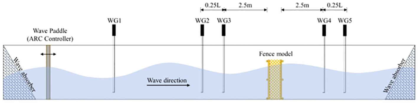 A total of five wave gauges, labeled WG1–5 (Figure 3), were deployed in the experiments. WG1, located near the wave board at the front of the flume, was used to control the wave generation system for nonreflective wave generation experiments (ARC). WG2–5 were directly connected to the wave height acquisition system, providing digital signals of the water depth with a sampling frequency of 500 Hz and an accuracy of 5‰. Among them, WG2 and WG3 in the front of the fence model were used to measure the reflected wave height (Hr), while WG4 and WG5 at the rear of the fence model were used to measure the transmitted wave height (Ht). Both pairs of wave gauges were positioned 2.5 m away from the fence model, and the distance between the two gauges of each pair was 0.25 times the incident wavelength (L). Incident and reflected waves were separated via the method proposed by Goda and Suzuki (1976).