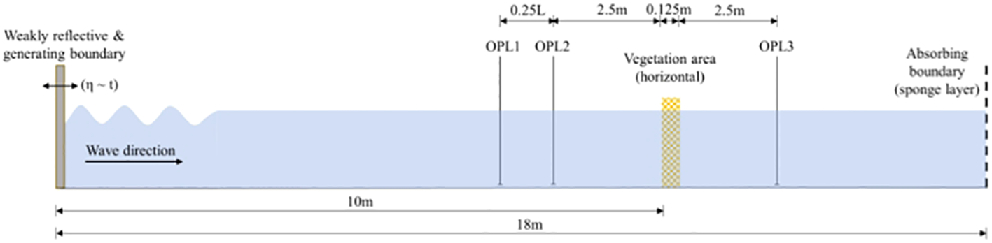 The fenced model area was generalized with the vegetation module of the SWASH model to simulate its impact on wave propagation. The drag and inertia forces acting on a single bamboo stick in the control equations of the SWASH model are shown as Equation 18: