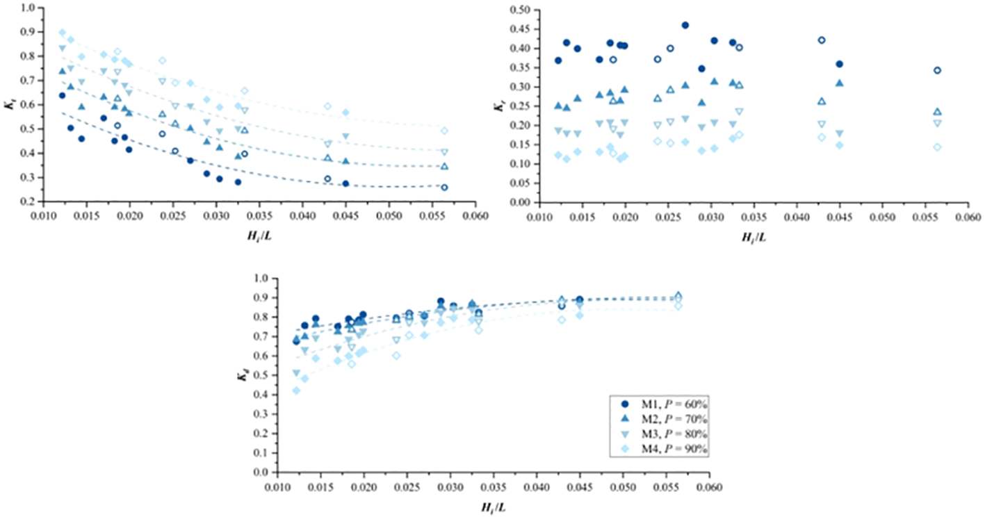 The primary mechanism through which incident wave characteristics influence wave transmission through the fences is attributed to the variations in water particle motion patterns. Wave steepness exhibits a negative correlation with wave period and still water depth. With increasing wave steepness, the flow velocity and acceleration also increase. Consequently, the interaction between the cylinders and steeper waves can generate heightened turbulence, along with an increase in the wave height. Conversely, long waves with longer periods not only possess greater power than shorter waves but also promote a more streamlined flow pattern between the cylinders (Jansen, 2019). This streamlined flow causes the formation of larger wake zones surrounding the elements, resulting in a more pronounced sheltering effect. These findings align with the observations of Thieu Quanga and Mai Trong (2020) during field monitoring, where it was noted that low-frequency waves can penetrate fences more easily. Additionally, in this experiment, an increase was demonstrated in the wave dissipation performance of the fences with increasing wave steepness, reinforcing the aforementioned observations.