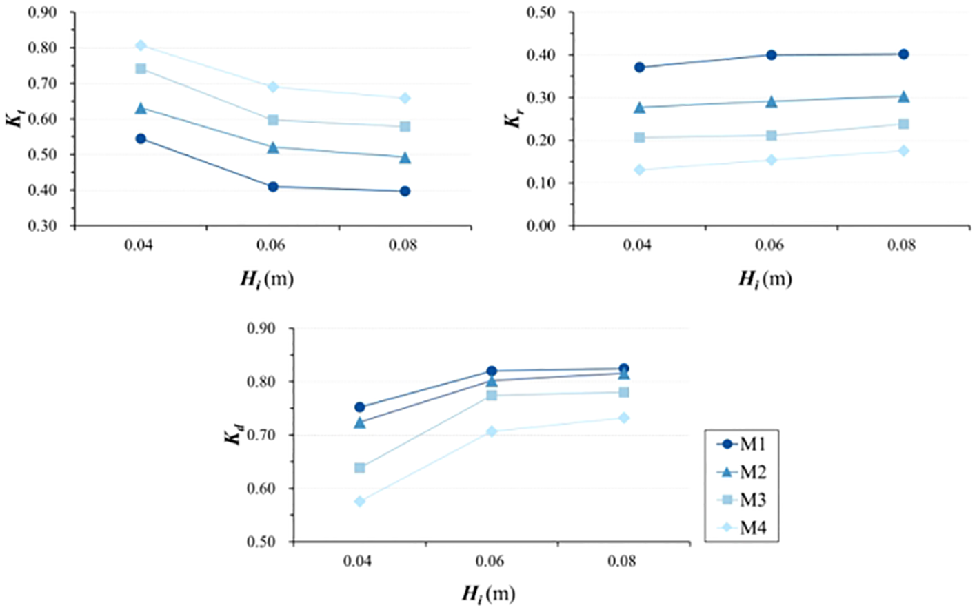 Influence of the wave height on the wave transmission process (i.e.,Kt, Kr and Kd).