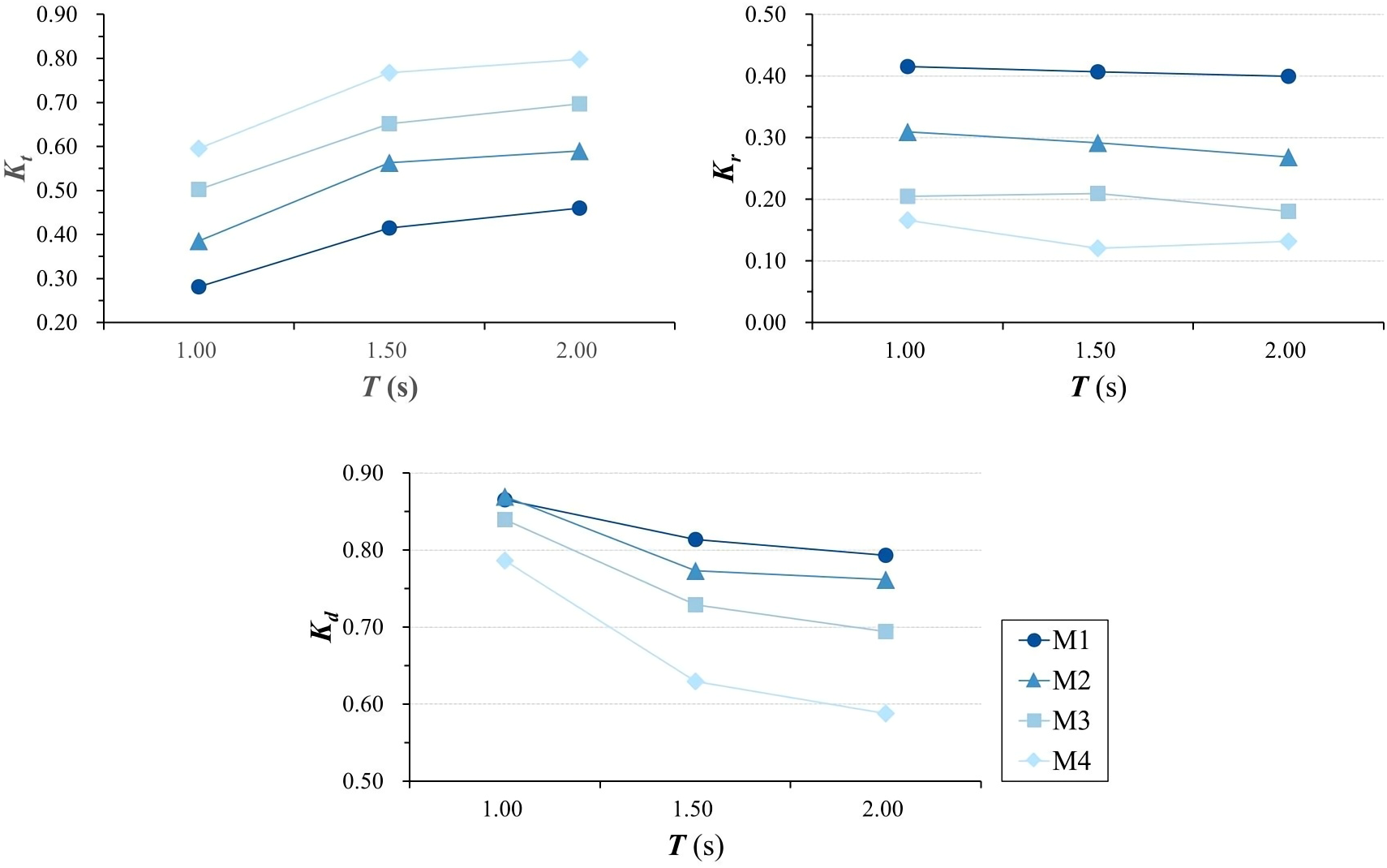 Influence of the wave period on the wave transmission process (i.e., Kt, Kr and Kd).