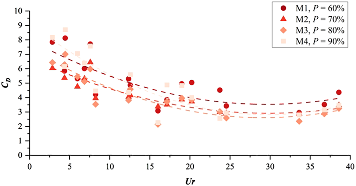 Based on the calculated theoretical CD values of the fences with different infill porosities (Figure 9), it is observed that the theoretical CD value of all four fences decreases with increasing wave nonlinearity. The fence with the highest infill density, M1, exhibits a bulk drag coefficient that ranges from 3.0–8.1, while that of M2 ranges from 2.9–6.4, that of M3 ranges from 2.2–7.0, and that of M4 ranges from 2.2–8.7.