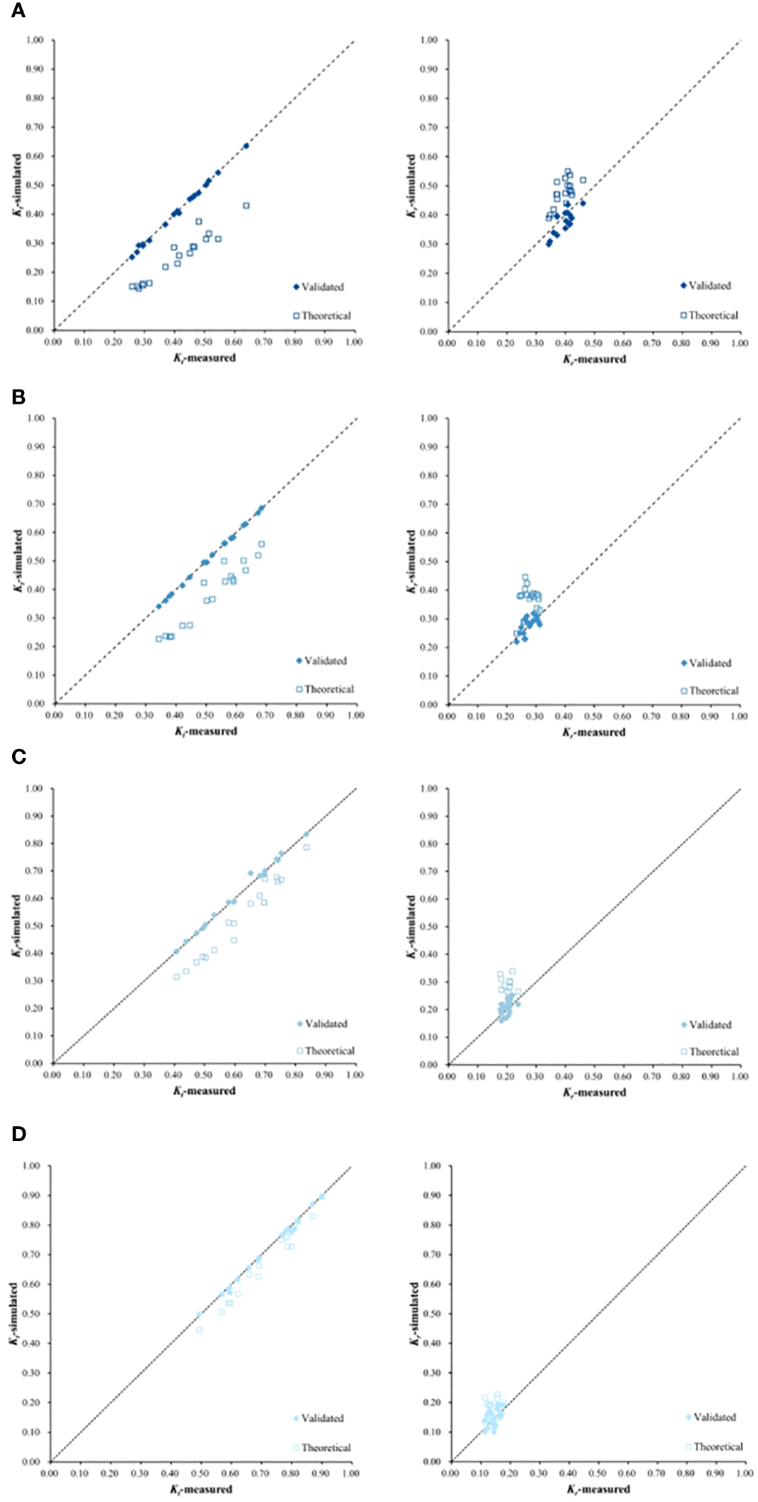 Simulated and measured values of the wave transmission and reflection coefficients of fences M1-M4: (A) M1, (B) M2, (C) M3, and (D) M4.