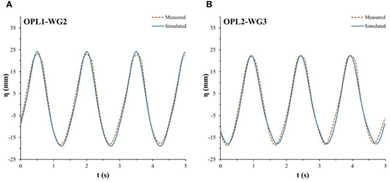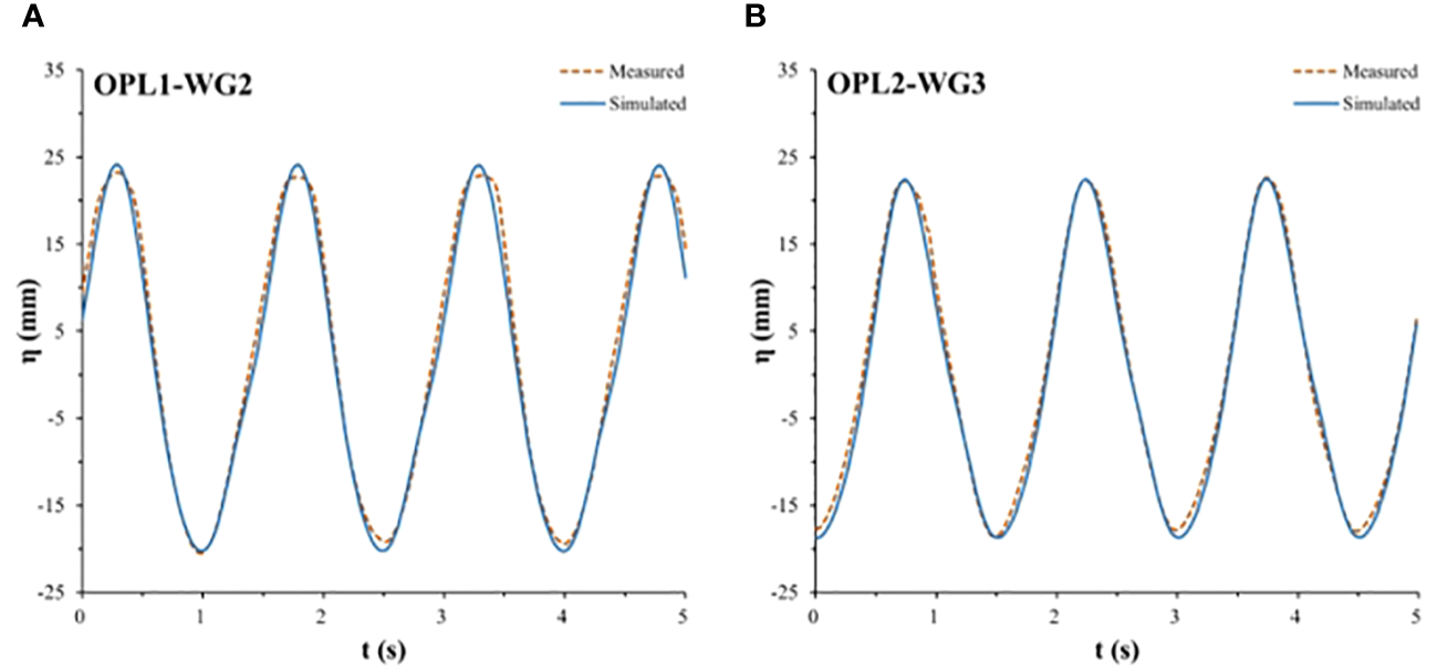 To further verify the accuracy of the numerical model in simulating water levels using the validated bulk drag coefficient values of the fences, water level time series measurements at the fence front locations WG2 and WG3 were selected and compared to the water level time series at model locations OPL1 and OPL2. Figures 12, 13 show the comparison results between the measured values and simulated values of Models M2 and M4, respectively, under wave conditions of d = 0.25 m, Hi = 0.04 m, and Tp = 1.50 s. The results demonstrate favorable agreement between the model-simulated water levels and the experimentally measured values.