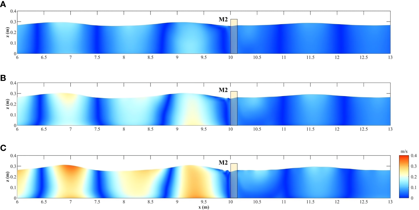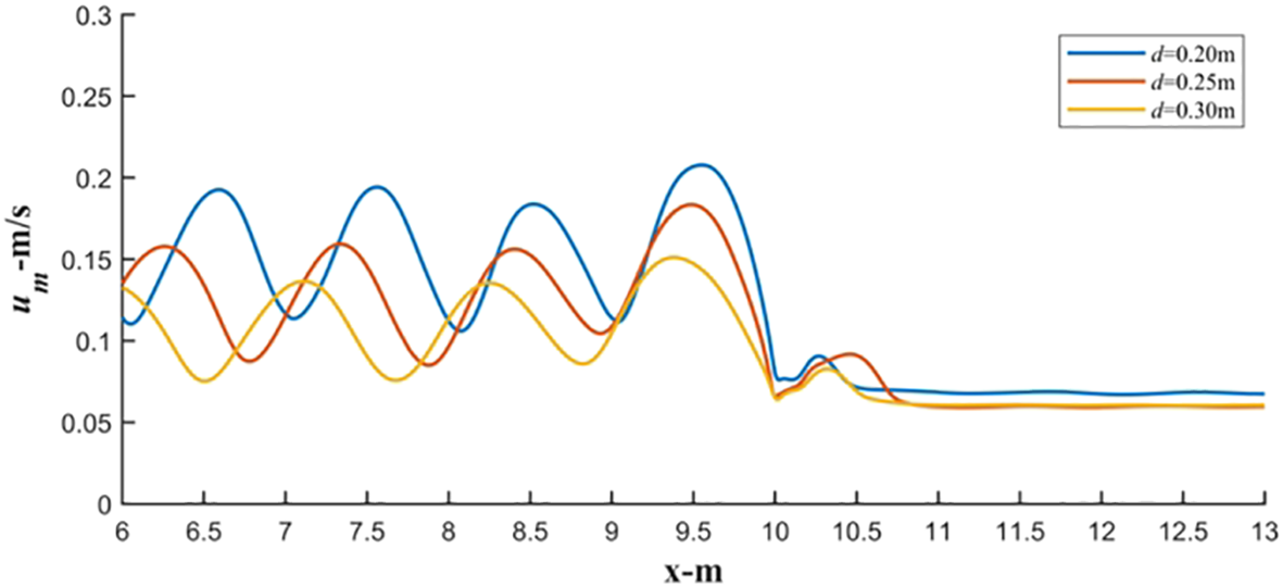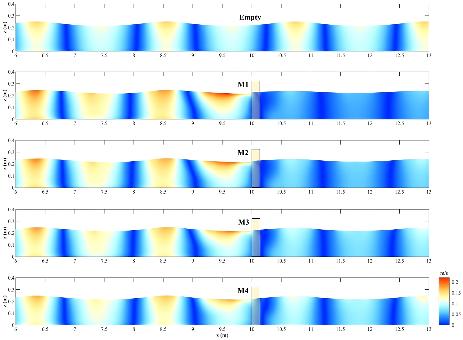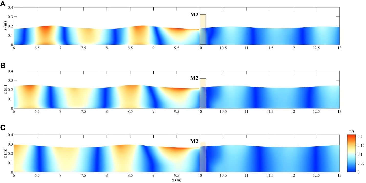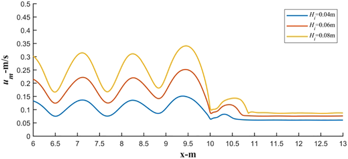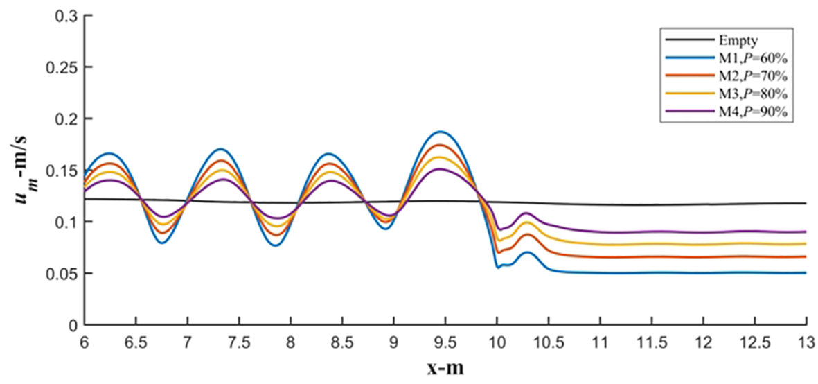The incident wave conditions also impact the flow velocity distribution characteristics around the fence. Increasing the water depth imposes an insignificant influence on the flow velocity distributions in front of and behind the fence, but it causes a significant reduction in the maximum bottom velocity in the front section. Increasing the wave height causes an increase in the flow velocity magnitude in the layers behind the fence and leads to a significant increase in the maximum bottom velocity in front of the fence. The maximum bottom velocity behind the fence also increases to some extent. Finally, an increase in the incident wave period results in a decrease in the flow velocity magnitude in the flow layers in front of the fence and causes a change in the position of the maximum bottom velocity, although the maximum values remain relatively close. It also yields an increase in the flow velocity magnitude in the rear layers and the maximum bottom velocity.