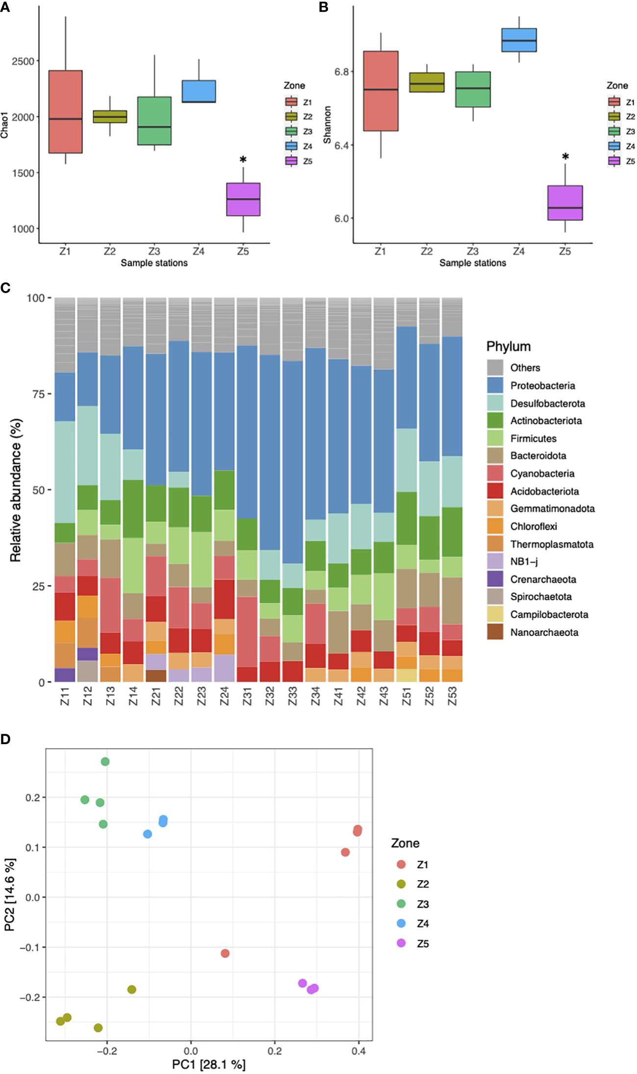 Comparison of sediment bacterial composition between sampling stations in the Mar Menor. Boxplots with alpha diversity metrics for the five sampling stations (Z1–Z5) calculated with Chao1 (A) and Shannon index (B), bars are colored by sampling site (*Kruskal-Wallis test, p-value 0.05). (C) Relative abundance (%) of bacterial and archaeal top phyla. The category ‘Others’ accounted for phyla that were represented by < 2.5% abundance. (D) PCoA of Bray-Curtis distances between all samples, colored by sampling station (Z1-Z5).