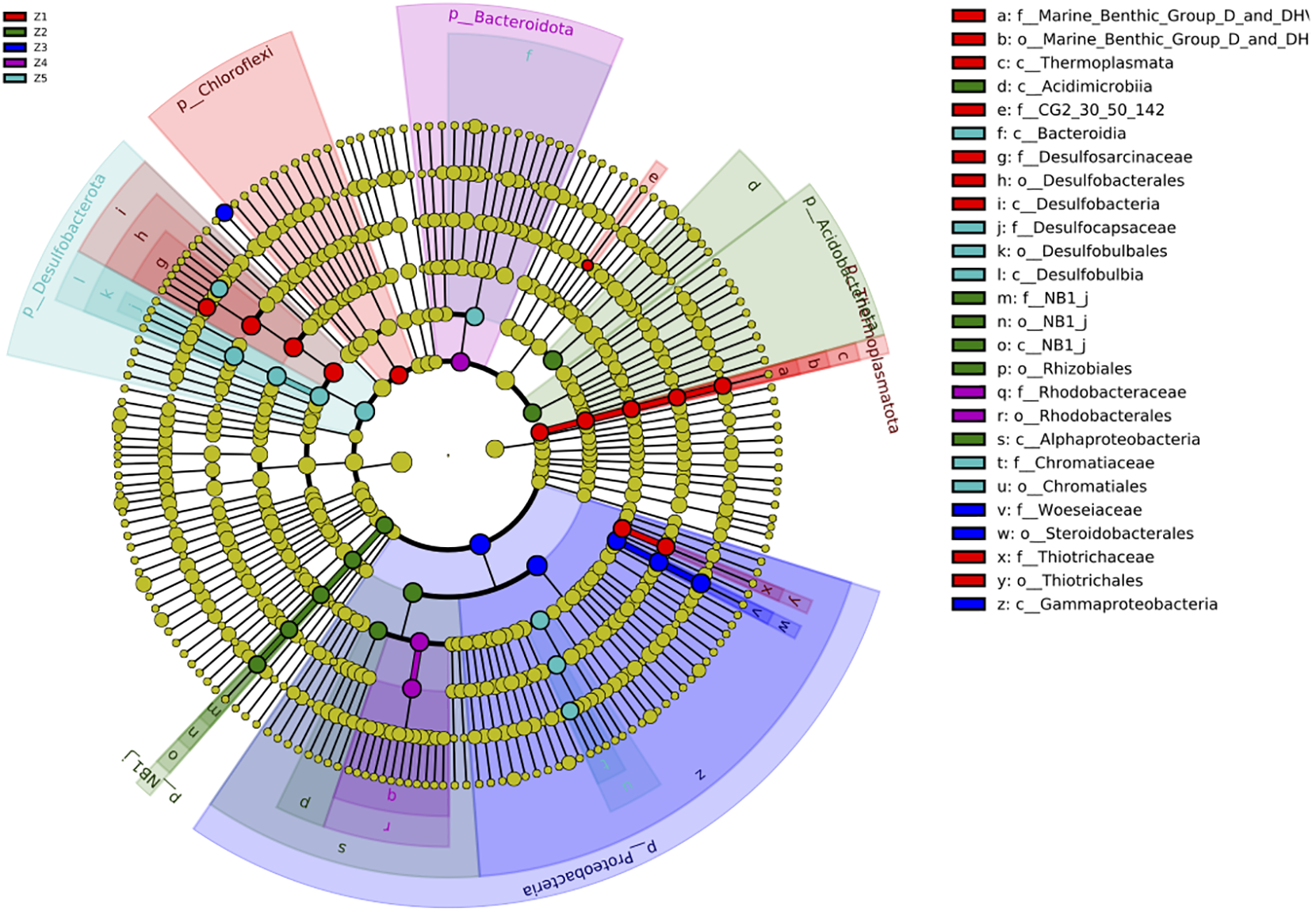 To find more detailed differences in the taxonomic composition of the 5 microbial communities associated with the 5 sampling zones, a Linear discriminant analysis Effect Size (LEfSe) was performed using phylum-to-species level data. This analysis allowed us to identify discriminating bacterial and archaeal taxa from marine sediments that could serve as ecological biomarkers. The LEfSe of all species found in the five sediment sampling zones (Z1, Z2, Z3, Z4 and Z5) were analyzed together, resulting in 26 taxa with significant differences (LDA Score > 10,000; Figure 2). Members of Desulfobacterota (class Desulfobacteria, order Desulfobacterales, family Desulfosarcinaceae) and Chloroflexi phylum, Thiotrichales order (family Thiotrichaceae) and the uncultivated family CG2-30-50-142 (phylum Actinobacteriota) were identified as bacterial biomarkers of the Z1. Interestingly, Z1 was the only microbial community showing an Archaea biomarker, as it was enriched in the Thermoplasmata class. Z2 was enriched with members of the Acidobacteriota and the non-cultivated phyla NB1-J, the classes Acidimicrobiia and Alphaproteobacteria as well as the order Rhizobiales. In the case of Z3, most bacterial taxa identified as bacterial biomarkers belong to the phylum Proteobacteria, including the class Gammaproteobacteria and the order Steroidobacterales (family Woeseiaceae), while in Z4 only two bacterial taxa were consistently enriched, the phylum Bacteroidia and the order Rhodobacterales (family Rhodobacteraceae). Finally, the LEfSe analysis in Z5 shows a significant enrichment in members of the phylum Desulfobacterota (class Desulfobulbia, order Desulfobulbales, class Desulfocapsacea), the order Chromatiales (family Chromatiaceae), the class Bacteroida and the genus Desulfosarcina (order Desulfobacterales).