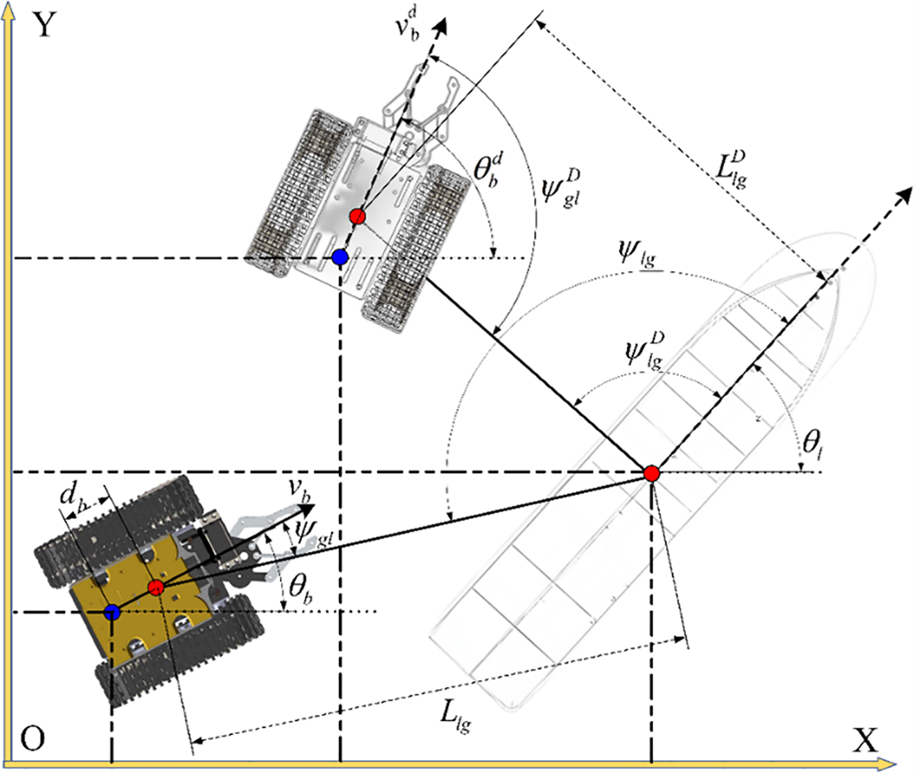 is the matrix of geometric features of the desired formation of leaders and followers in the global generalized coordinate system, is the real formation feature matrix, is the follower device, and is the leader device. Taking the geometric position of a single ship and a single robot as an example, the formation relationship of the formation system is shown in Figure 2.