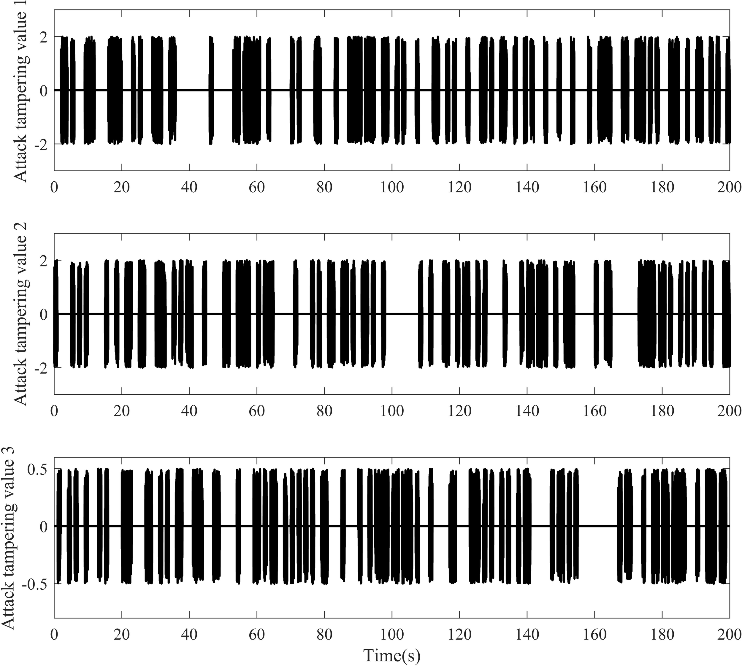 The stealthy deception attack probability is , and is the attack random tampering amount. are wind, wave, and current disturbances (Zhang et al., 2022), , , and ; is the amount of external disturbance (Chen et al., 2023) encountered by the ROV during its movement, and is Gaussian white noise with a power of one. The total simulation time is , and the step size of the simulation is . The amount and number of USV three-channel attack tampering is shown in Figure 4.