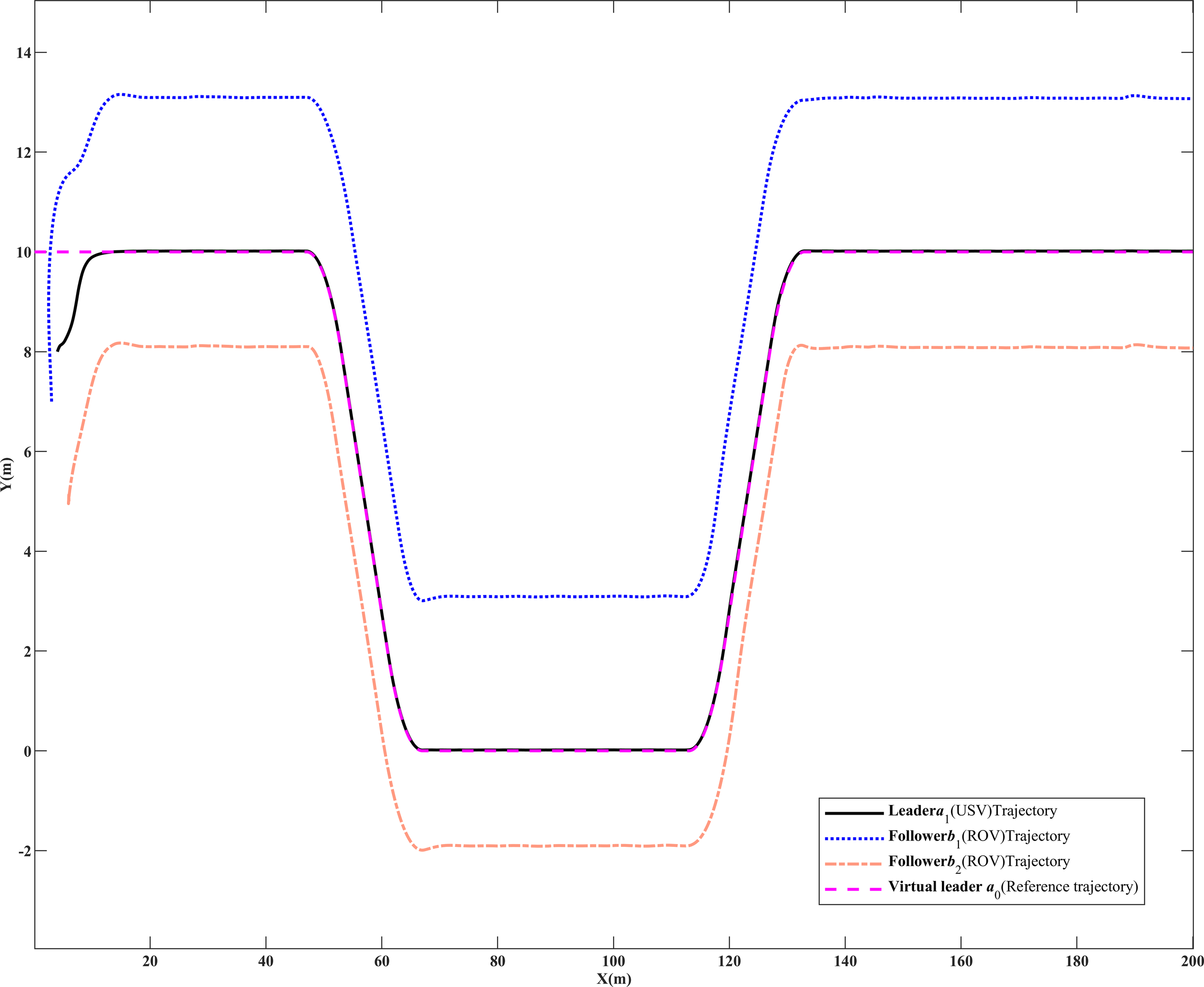 For the scientific rigor of the simulation, the ROV in the USV-ROV formation system uses the submarine operation ROV in the literature (Chen et al., 2023); the mass is , the width is , the driving wheel radius is , the distance between the center of mass and the center of gravity is , the driving input is , and the moment of inertia is . The USV chooses the ship CyberShip II (Zhang et al., 2022) of the Norwegian University of Science and Technology as the simulation object, which has double symmetrical propellers, double tail rudders, and single side thrusters; the mass is the length of the hull is , the width is , and the drive input is . At the same time, the parameters are , , , , , , , and .