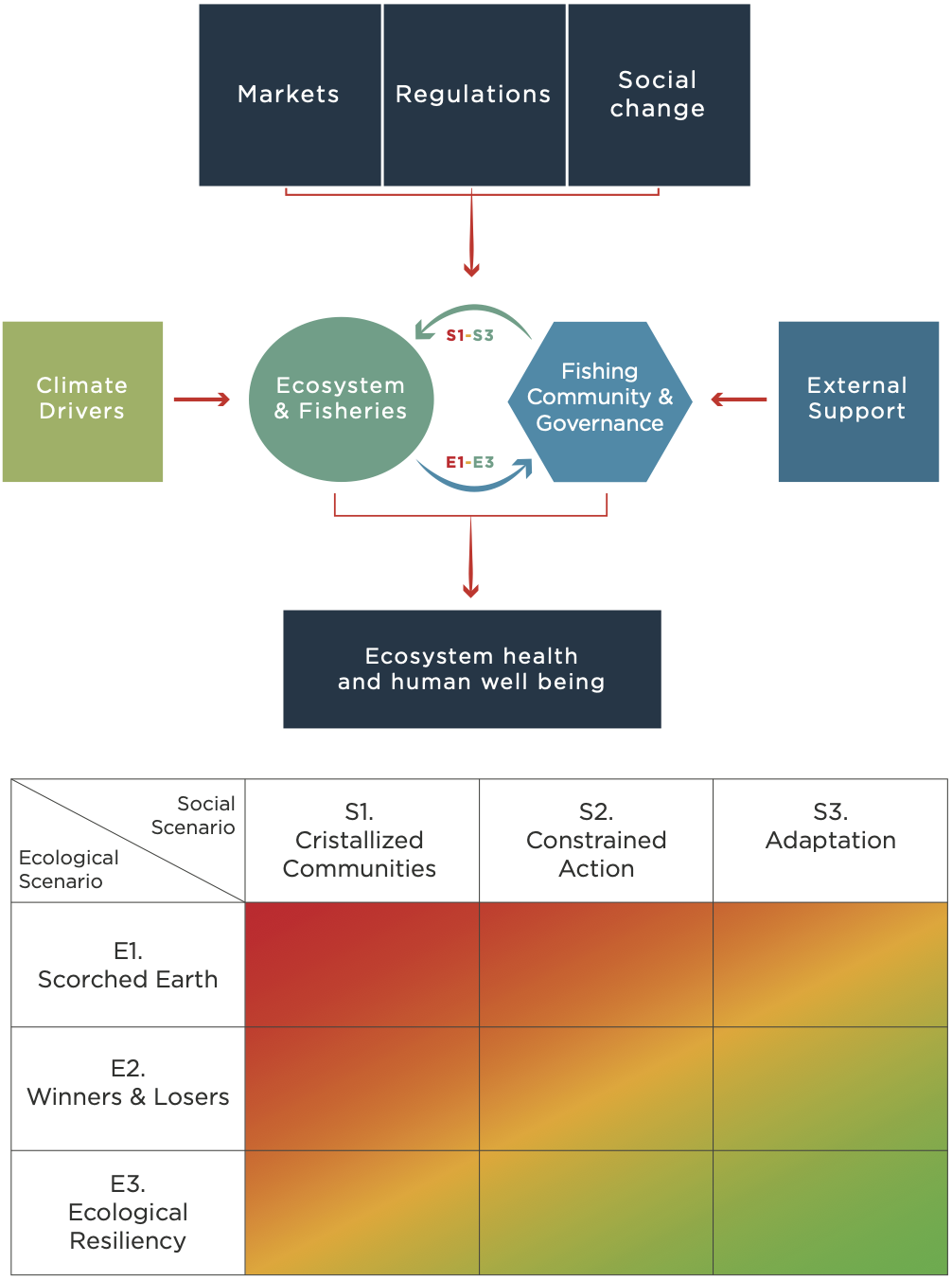 Different combinations of the possible ecological and social responses to environmental change or other shocks will result in different outcomes for SES (Figure 1), that might range from becoming locked in a social-ecological trap (Holling, 2001; Cinner, 2011; Steneck et al., 2011) to exhibiting high resilience and adaptive capacity (Koontz et al., 2015). For instance, in the lack of tenure rights and cooperative solutions, uncontrolled fishing effort leads to the overexploitation and, in some instances, the collapse of fisheries (as in scenarios E1). This reduces income and, as a consequence, the capacity to accumulate organizational and economic capital (Gordon, 1954; Schaefer, 1957). Lack of capital and capacity prevents the community from adopting solutions aimed at diversifying activities or temporarily reducing harvesting to allow for fishery recovery (as in scenarios S1), in a reinforcing cycle between poverty and overexploitation of renewable resources. Therefore, each combination of social-ecological scenarios will feedback into each other and either amplify a positive feedback loop, or weaken it, resulting in a possible shift to alternate scenarios. Climate variability can also shift an ecosystem from one scenario to another, with shifts more likely in those scenarios that are less stable (weakening feedback loop; Figure 1).