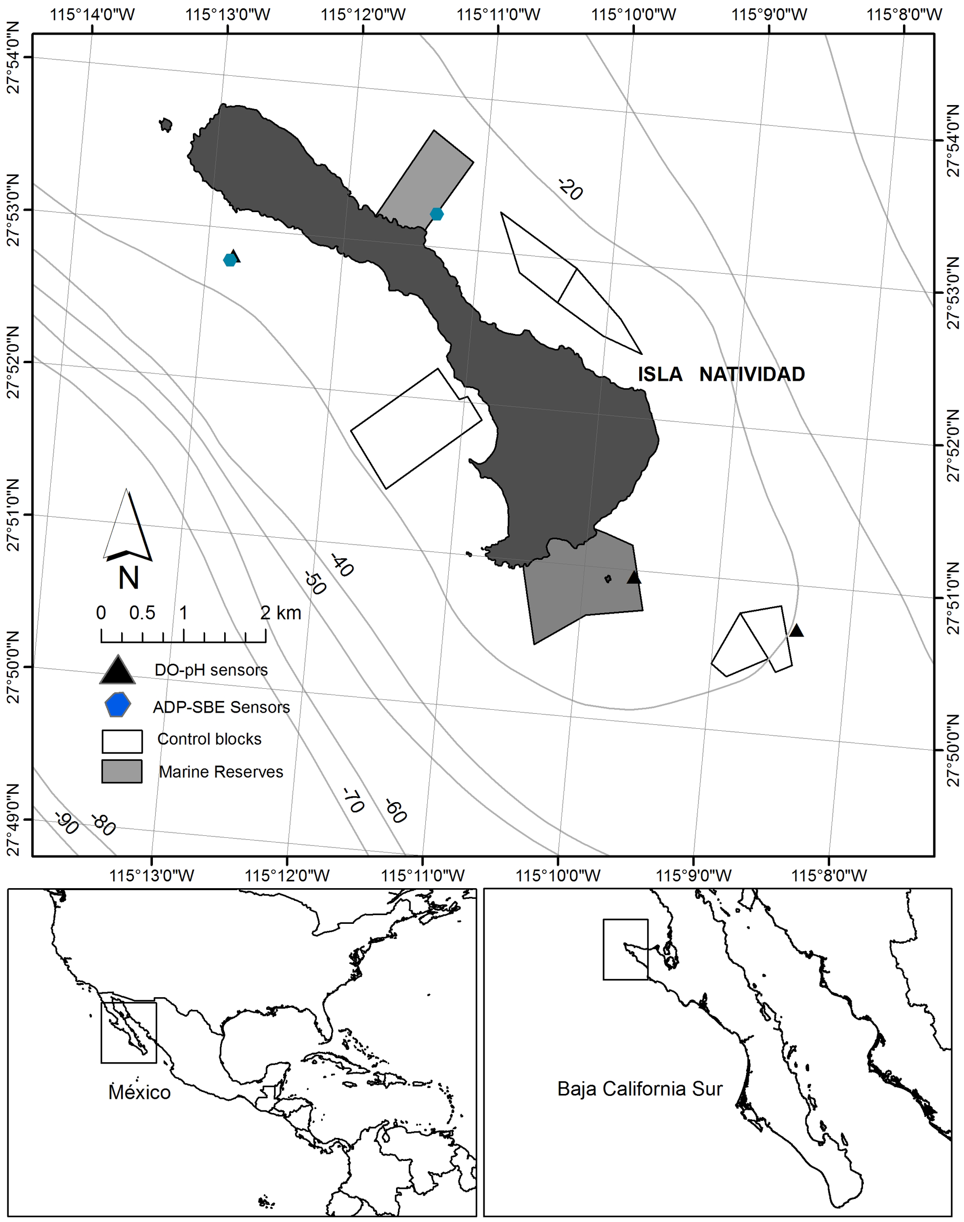 Location of Isla Natividad, Baja California Sur, Mexico. The top panel shows the location and boundaries of the two marine reserves established and enforced by the local community in 2006, and the three reference fished areas monitored yearly, between 2006-2018. The black triangle indicates the location of the nearshore oceanographic mooring. Coordinates (lat and long) indicate the exact location of Isla Natividad and study sites around it. The bottom right panel shows the location of the Baja California Peninsula (within the rectangle), on the southwestern side of the North American Continent. The Bottom left panel shows the location of Isla Natividad (within the rectangle), on the Pacific Ocean side of the Baja California Peninsula.
