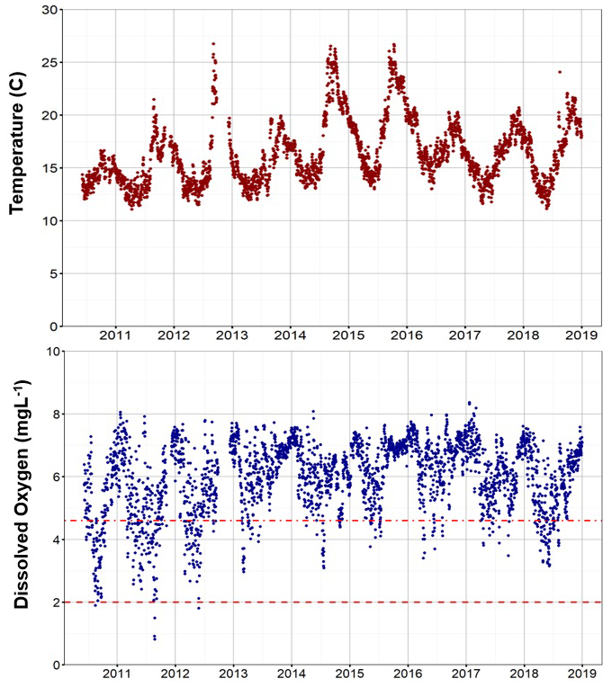 Daily average water temperature and DO concentrations at 14 m depth between 2010 and 2019. The dashed lines mark the 4.6 and 2 mg/L DO thresholds reported to be associated with sublethal and lethal effects, respectively, in multiple marine species tested in the laboratory (from Vaquer-Sunyer and Duarte, 2008).
