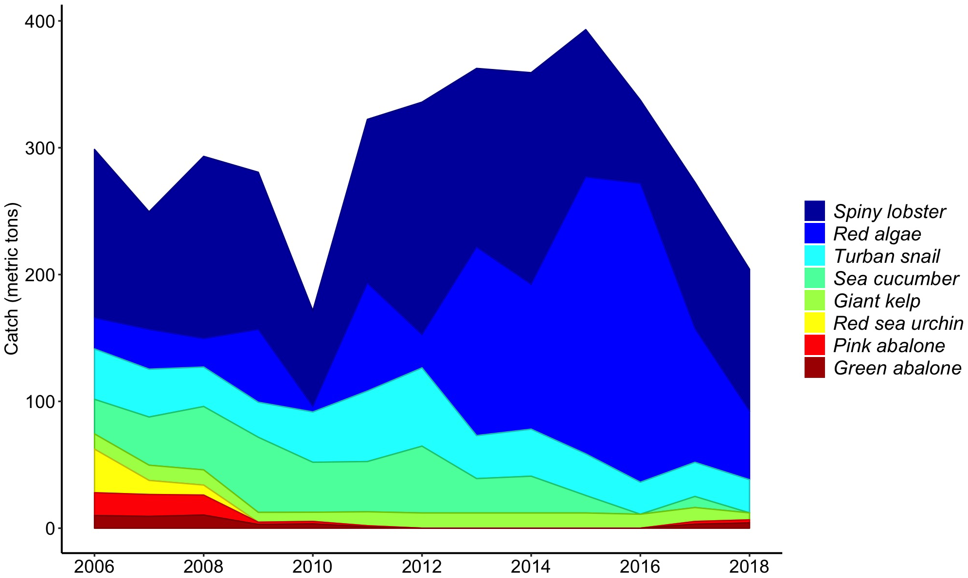 Here we report results for the main benthic invertebrates and algae for which the cooperative holds exclusive access rights: the pink and green abalone; the spiny lobster; the sea cucumber Parastichopus parvimensis; the wavy turban snail, Megastraea undosa; and the red alga Gelidium sp. For kelps, which form the productive marine forests on which these fisheries depend, and their main consumers, we analyzed both harvested species (the giant kelp; and the red sea urchin Mesocentrotus franciscanus), and kelp (Eisenia arborea), sea urchin (the black and purple sea urchins, Centrostephanus coronatus and Strongylocentrotus purpuratus), and mollusks (the keyhole limpet Megathura crenulata) that are not currently harvested, but play important ecological roles as foundation species and key grazers and could support future fisheries. Finally, we report results for two abundant kelp-associated finfish species that are fished locally (the sheephead, Semychossiphus pulcher, and the kelp bass, Paralabrax clathratus), but for which the cooperative does not hold exclusive access rights (restricted to invertebrates and algae). Several finfish species (yellowtail, whitefish, sheephead, and kelp bass) are caught for local consumption and sale in national markets. Finfish prices are low (US$1-10/kg) and the contribution to the local economy has historically been limited for this fishing cooperative. The cooperative keeps records for the catch of all commercial species, which were included in these analyses as well.