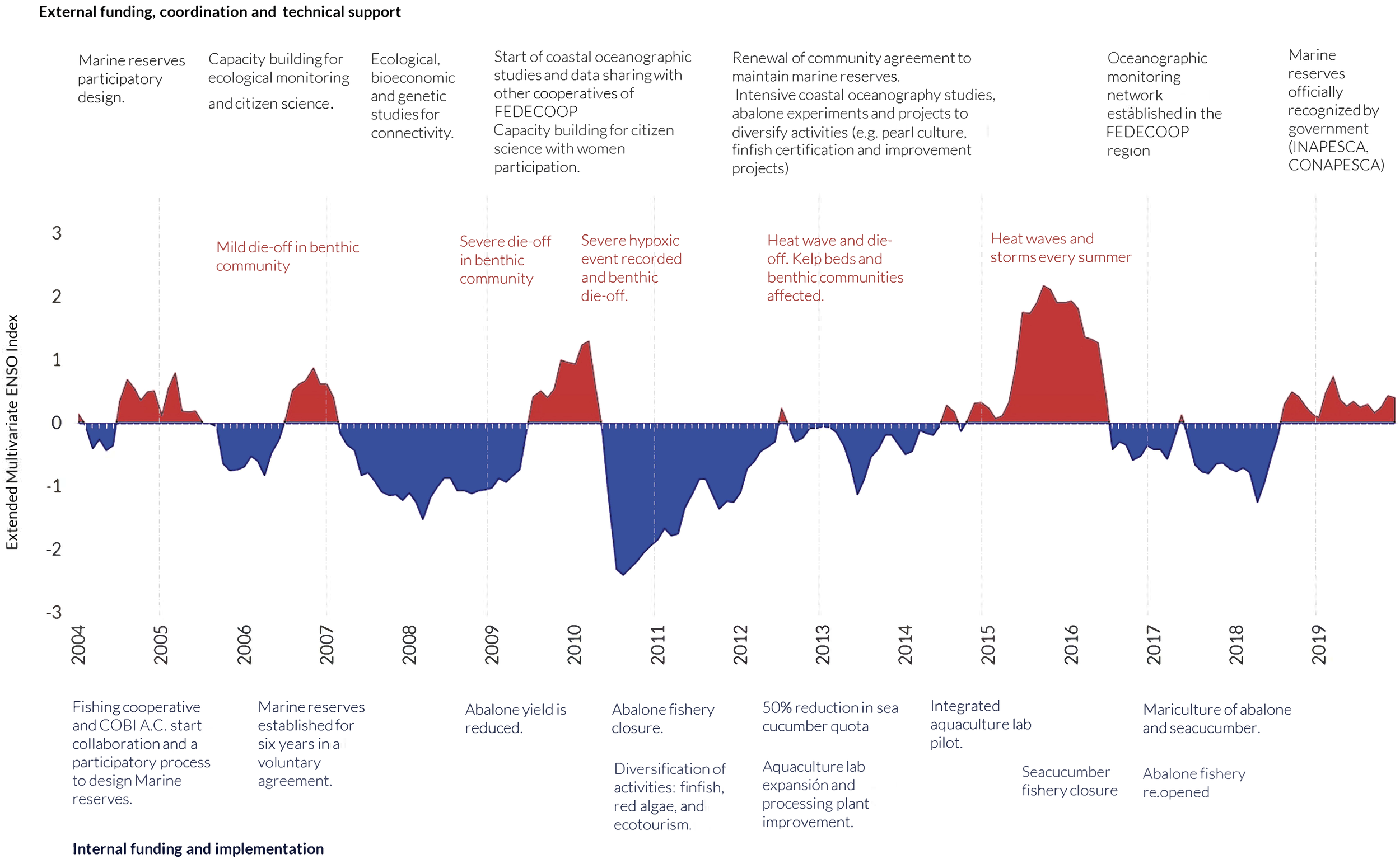After the El Niño event of 1982/1983, Mexico’s abalone populations were in dire shape and the commercial fishery was on the verge of collapse. At this critical junction, fishers from the region agreed to partake in co-management of the resource as well as in scientific research with government officials and external scientists – a responsibility that they have upheld to this day. Resulting from this process, strong social capital has emerged over time, both within the cooperatives and beyond, with government, CSOs and scientists. The 1997/1998 El Niño and Hurricane Nora provided another opportunity for the cooperatives to learn from severe environmental change and the importance of preemptively safeguarding resources. Understanding their role as active agents capable of buffering the effects of environmental change generated at higher scales is indicative of high levels of perceived human agency among fishers in the region. This history explains, in part, why adaptive capacity has materialized into the adaptive behaviors and action exemplified by the Isla Natividad case study; perceived risk from environmental change is high in this and other cooperatives that have experience with previous crises, and the cooperative has access to high quality information and data about the ecological impacts of environmental change based on their long history of working side by side with scientists.