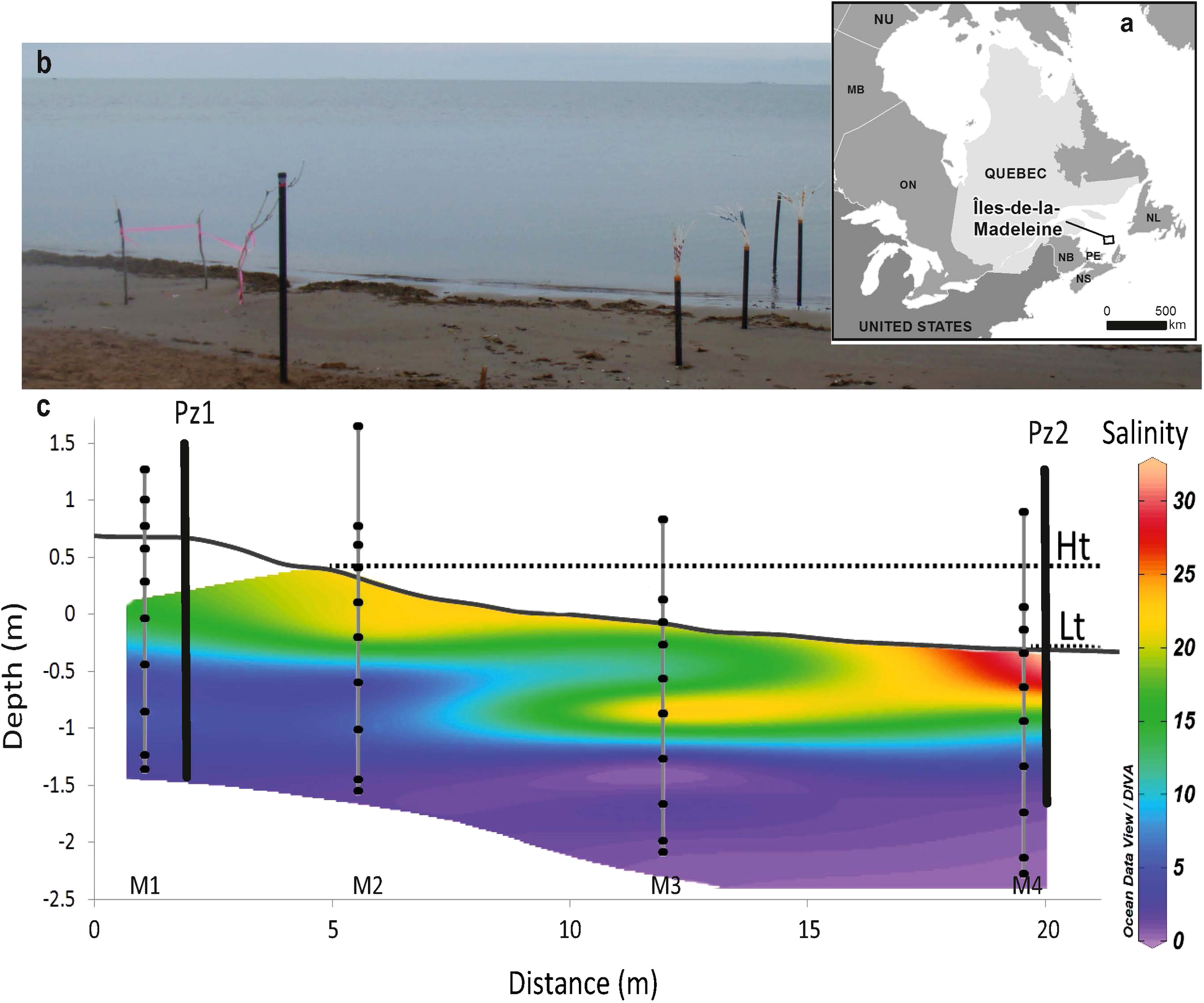 (A) Location of the Magdalen Archipelago in the southeastern part of the Gulf of St. Lawrence; (B) View of the Martinique Beach and the studied cross-shore transect in the intertidal zone of the beach; and (C) the cross-sections of transect showing the topography and distribution of practical salinity. Contour line was determined by linear interpolation in Ocean Data view software. Black dots refer to groundwater sampling points and vertical black lines, labelled Pz1 and Pz2, represent the position of piezometers. Depth was reported relative to the mean sea level (0 cm) and was determined from DGPS measurements. The position of high tide and low tide marks (Ht and Lt) are also reported.