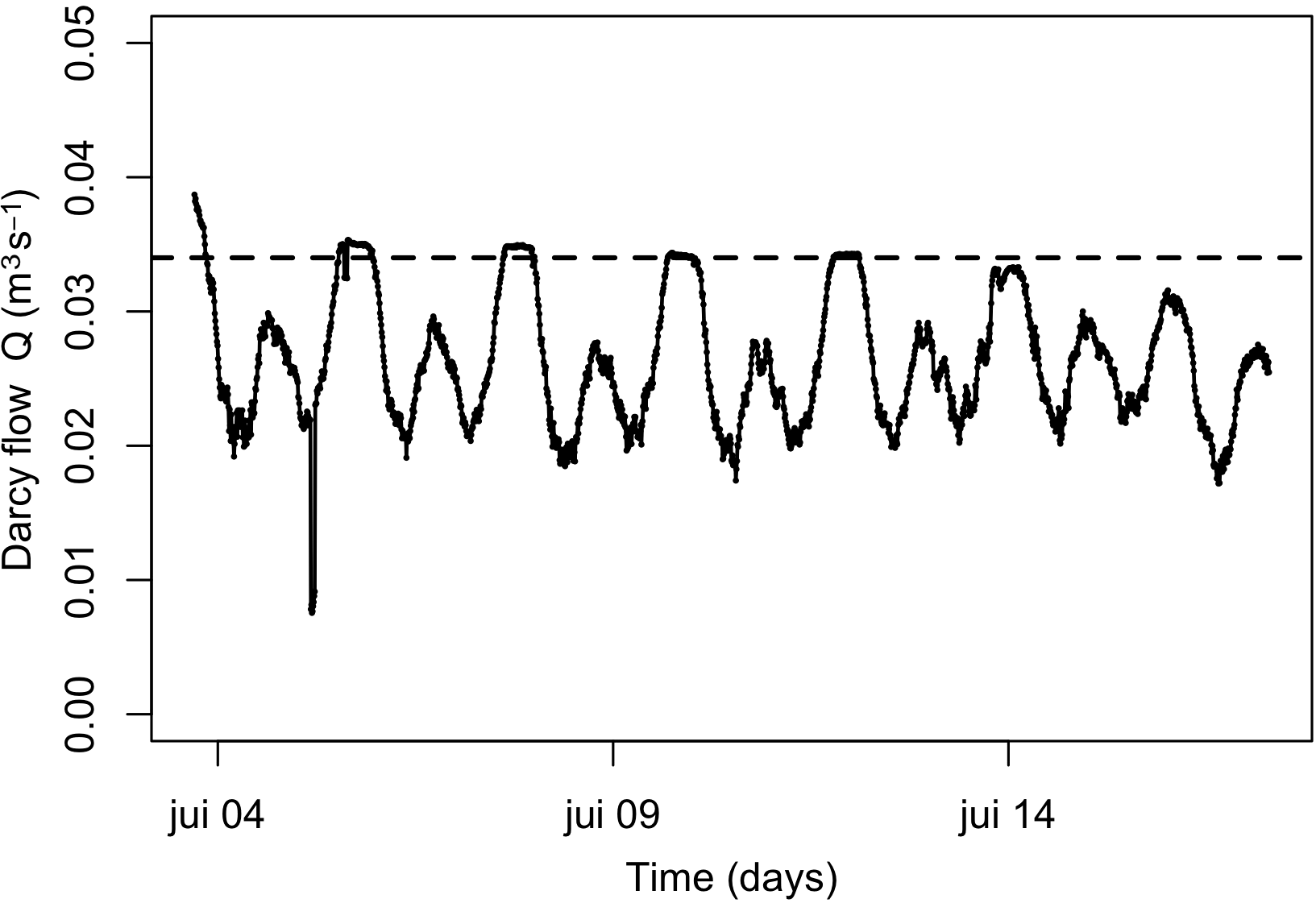 Time series of Darcy flow computed from head gradients between Pz1 and Pz2. The dashed line is the mean maximal Q value calculated over the 14-day study.