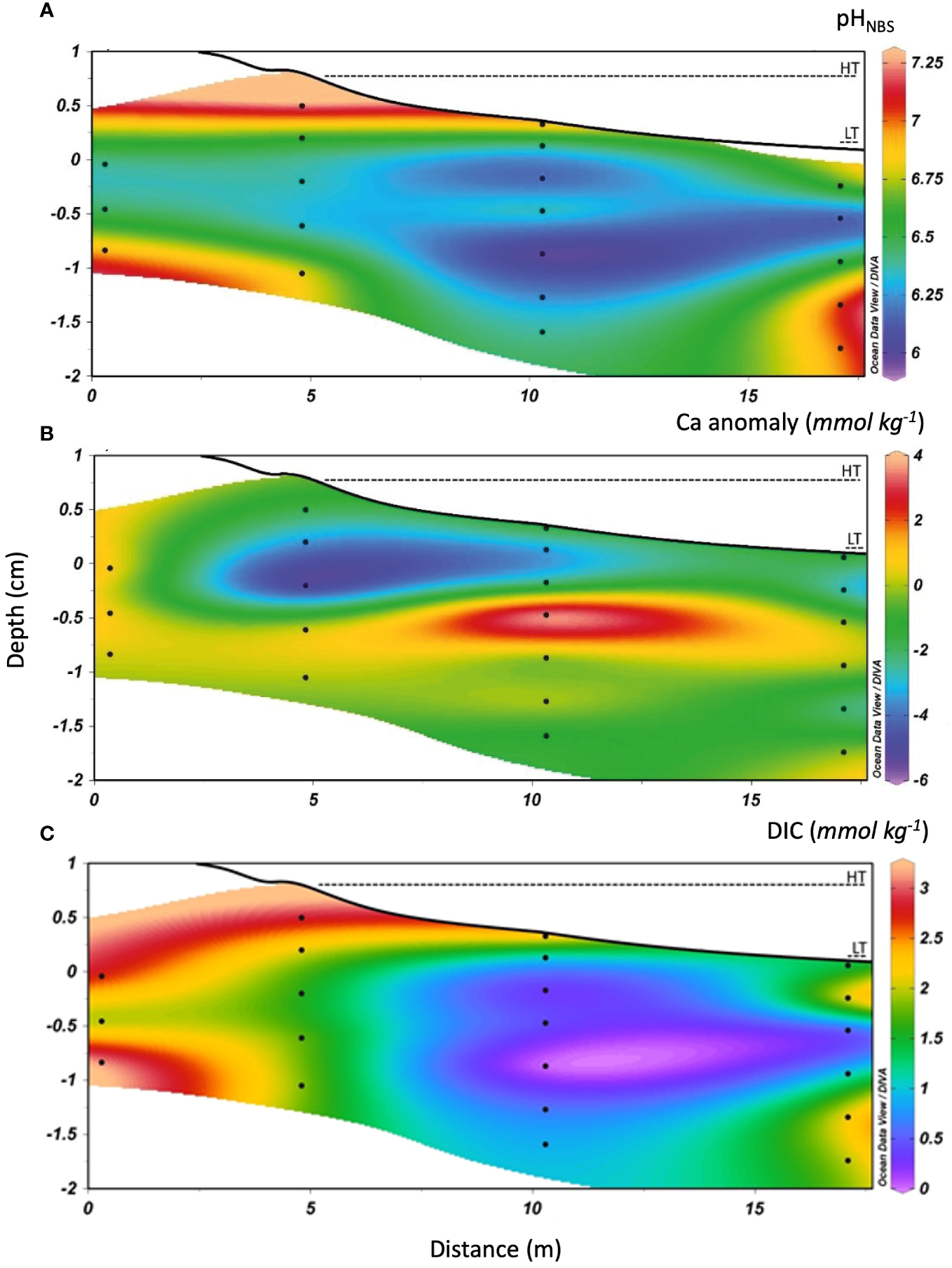 Cross-section of transect M1–M4 showing the topography and distribution of (A) pH, (B) calcium anomaly and (C) DIC concentrations along the STE. The high tide (Ht) and low tide (Lt) marks are identified by dashed lines. Contour lines were determined by linear interpolation on Ocean Data View software that reproduced the empirical data set with a 0.95 confidence level. Depth is reported relative to the mean sea level (0 cm) and was determined from DGPS measurements. Black dots represent the depths at which samples were collected using multilevel samplers.